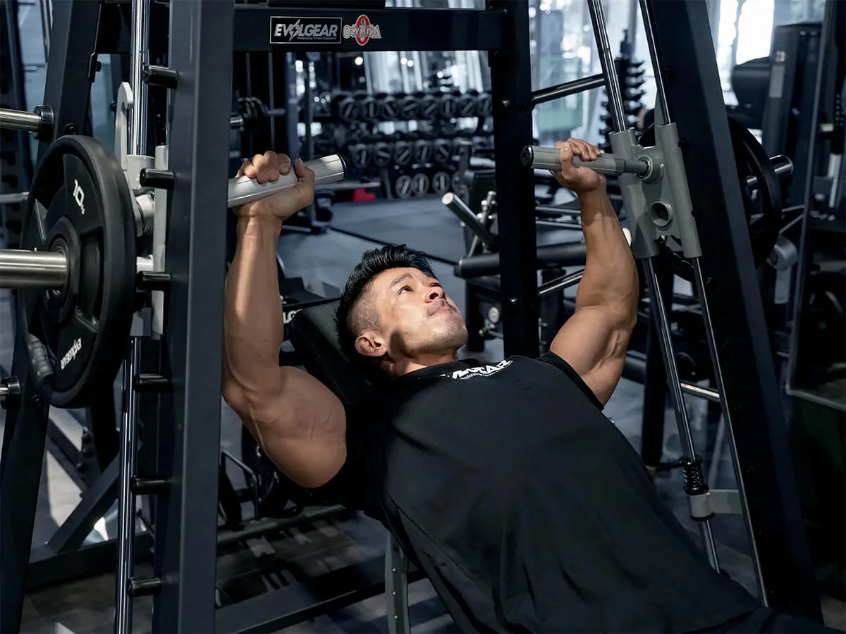 このデュアルスミスマシンが普段のスミスマシンとはどう違うかと言うと、ストレートバーに比べて内側に刺激が入りやすいという点が大きな特徴です。チェスト・肩は内側に負荷を掛けたほうが刺激が与えやすいので、ストレートバーを使うときと比べて負荷がかけやすいと感じました。インクラインにすることによって肩のフロント部分に刺激を与えやすいし、フラットベンチやデクラインベンチの場合はチェストに刺激を与えやすいんじゃないかと思います。さらに三頭筋にも刺激が入る。ちょっとファットグリップ気味になっていて、刺激が普通のグリップよりはわかりやすいので私好みでオススメのマシンです。