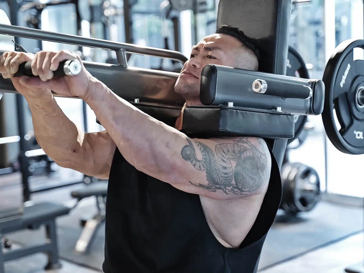 さらに、マシン後方に設置されているセーフティーバーを調整することで、可動域をコントロールすることができるのも嬉しい。トレーニングに慣れていない初心者の方が使用する場合は、セーフティーバーを高く設定して可動域を狭くすることで、「しゃがみ過ぎ」を防止することができる。