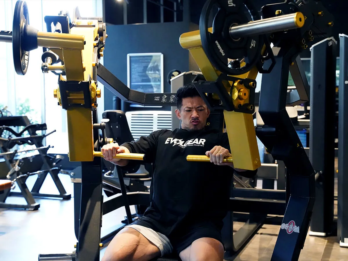 EVOLGEARの新たなプレートロード“Z”シリーズ。チェストプレスの特徴は、まず背もたれのシートが前後ろに調整できること。これで可動域の調整が可能になります。体型に合わせて、最初のポジションをセットできるのも嬉しいですね。さらにシートポジションの調整も可能。高さを合わせることで狙いたい部位、効きやすいポジションにセットが可能です。またアシストがついてますので、最初のスタートポジションが非常にやりやすくなっています。非常に負荷が抜けにくく、常に胸にテンションがかかっていく軌道になっていて、本当に大胸筋にダイレクトに入ってくる。非常に使いやすいマシンです。