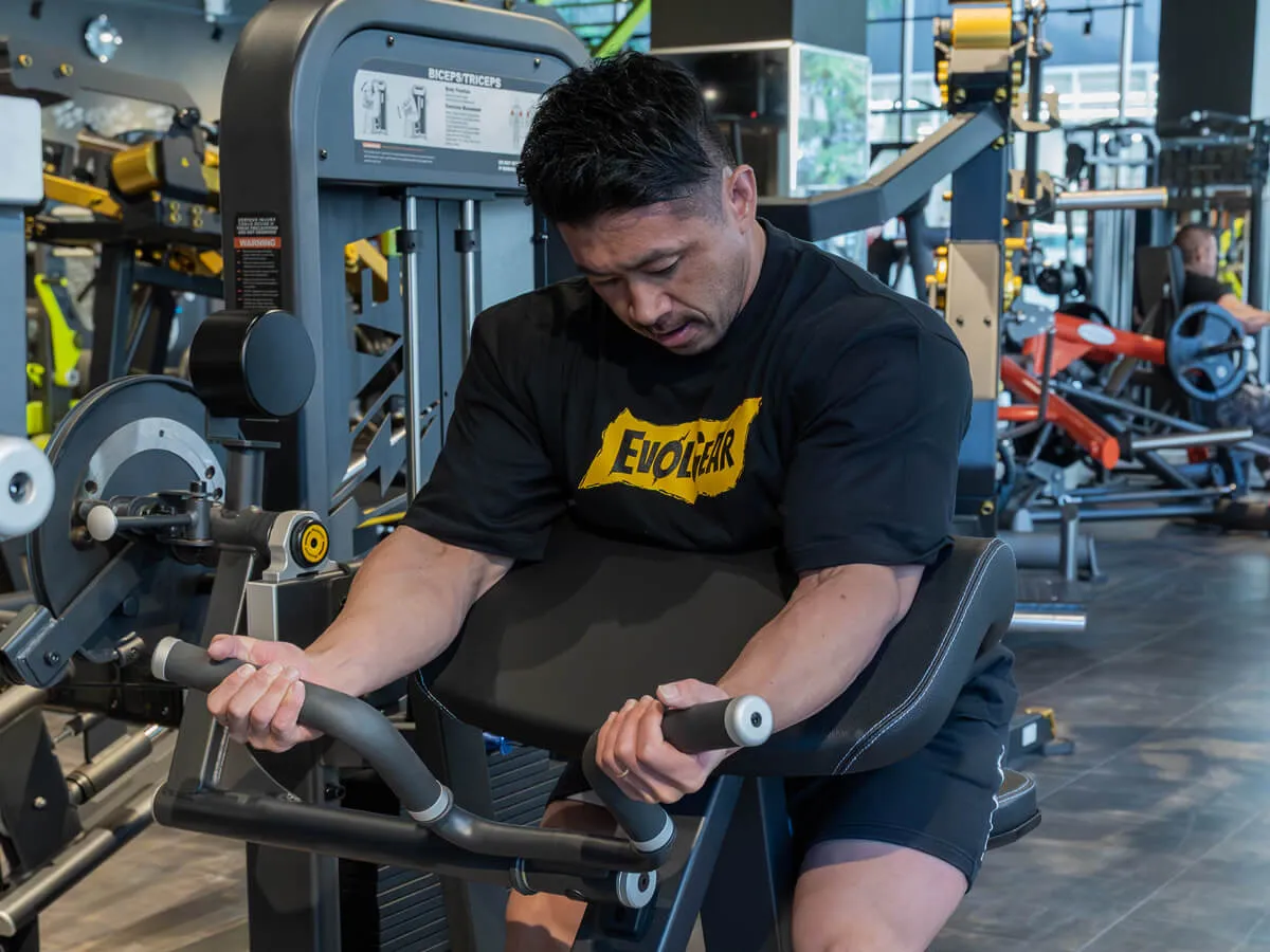 こちらは上腕二頭筋・上腕三頭筋の2つの筋肉を鍛えられるマシン。1台で2役こなすという非常に素晴らしいマシンです。ジムはもちろんホームジムなんかで、あまりスペースがないというときでも、これは1台で2つの筋肉を鍛えることができるから便利だよね。まずはトライセプスのポジション。簡単に可動域を調整することが出来る。そしてバイセプスもバーの位置を変えると、台に肘を置いたプリーチャーカールが出来る。そしてもちろんウェイトスタックはピン式で変更可能。簡単にウェイトを調整することが出来る。つまり、ドロップセットなどのトレーニングテクニックなども簡単に使いやすいということ。そして当然身長に応じてシートを調整出来るので、背が低い人から大きな人まで幅対応することができます。トライセプスは肘を固定したまま伸ばす事によって、三頭筋のアイソレートが可能になる。三頭筋のストレッチを安全に行うことが出来るので、例えばフリーウェイトやバーベルでライイングエクステンションをやると肘が痛いという人でも、このマシンであれば肘の痛みがない可能性が高い。そしてまだ痛めてない人でも痛める可能性が少ない。非常にポピュラーな種目を安全にトレーニング出来る優れたマシンだね。