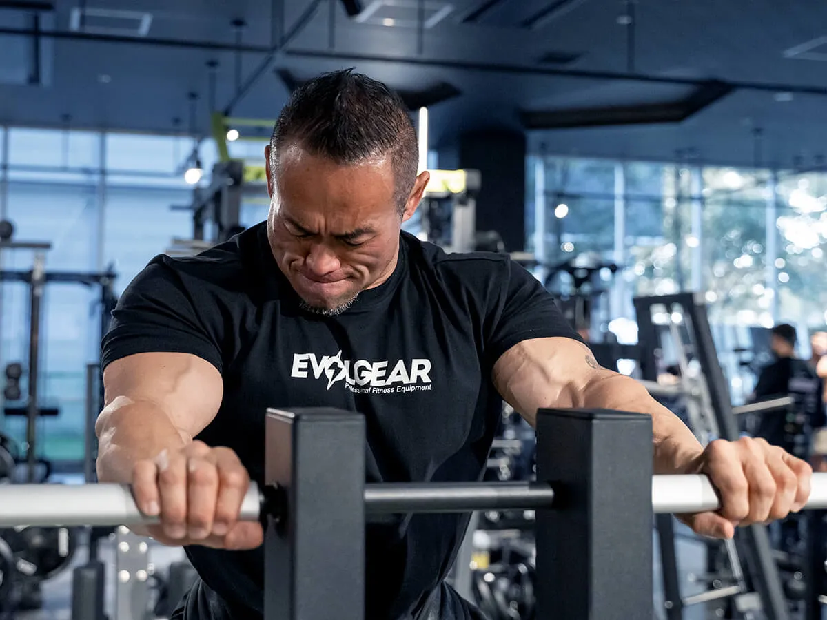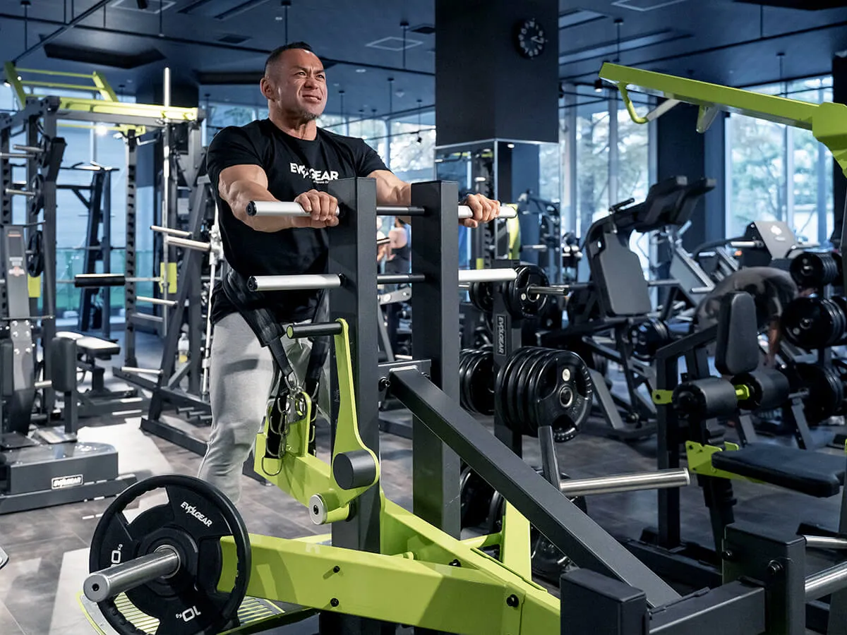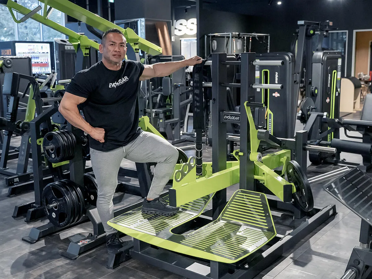 下半身トレーニングの王様であるスクワットをより安全に行えるマシン。スクワットはどうしてもウエイトを肩の上に乗せるので、腰の怪我が怖い種目。腰を実際に痛めている方はやりにくい種目でもあるけれども、それでもスクワットをやりたいという時にこのベルトスクワットがおすすめ。このマシンは肩の上にウエイトを乗せず、腰の位置でウエイトを支える事ができる。まずは備え付けのベルトを腰に巻いて、しゃがむ深さに合わせた位置でベルトとマシンを固定する。上体を支えて立ち上がり、ストッパーを外してスクワットをする。この時、腰にウエイトが掛かっているので、腰痛・腰に不安のある人でも安全に、そして深くスクワットができる。上体は自分の手で支えているので、比較的高重量を使っても自分で補助ができるのでとても安全。通常のスクワットであれば、補助者が必ず後ろに立っていなければならないが、このマシンだとそんなことはなく一人で行える点もメリットの一つ。グリップもEVOLGEARの他のマシン同様に三角形になっているので、握りやすい。例えば高重量だと持ち手が滑る心配もあるが、このマシンはしっかり握ることが出来るのでそういった点でも安全性が確保されている。安全に、効果的に下半身のトレーニングを可能とするこのベルトスクワット、おすすめです。