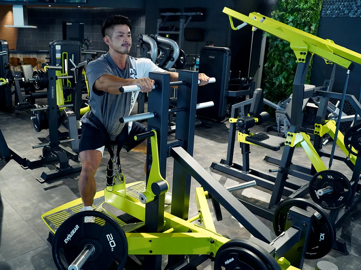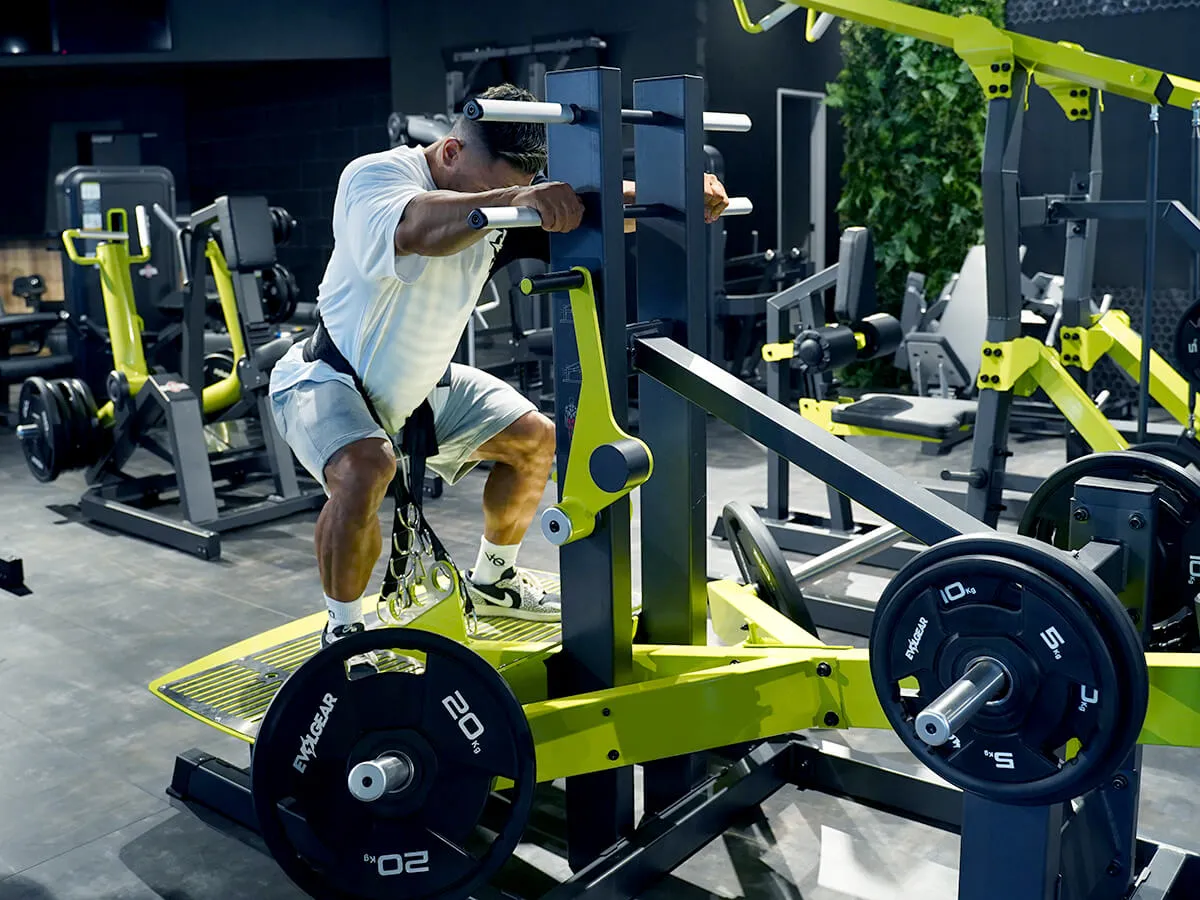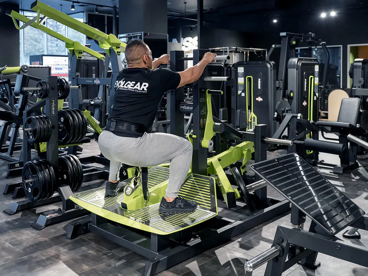 下半身トレーニングの王様であるスクワットをより安全に行えるマシン。スクワットはどうしてもウエイトを肩の上に乗せるので、腰の怪我が怖い種目。腰を実際に痛めている方はやりにくい種目でもあるけれども、それでもスクワットをやりたいという時にこのベルトスクワットがおすすめ。このマシンは肩の上にウエイトを乗せず、腰の位置でウエイトを支える事ができる。まずは備え付けのベルトを腰に巻いて、しゃがむ深さに合わせた位置でベルトとマシンを固定する。上体を支えて立ち上がり、ストッパーを外してスクワットをする。この時、腰にウエイトが掛かっているので、腰痛・腰に不安のある人でも安全に、そして深くスクワットができる。上体は自分の手で支えているので、比較的高重量を使っても自分で補助ができるのでとても安全。通常のスクワットであれば、補助者が必ず後ろに立っていなければならないが、このマシンだとそんなことはなく一人で行える点もメリットの一つ。グリップもEVOLGEARの他のマシン同様に三角形になっているので、握りやすい。例えば高重量だと持ち手が滑る心配もあるが、このマシンはしっかり握ることが出来るのでそういった点でも安全性が確保されている。安全に、効果的に下半身のトレーニングを可能とするこのベルトスクワット、おすすめです。