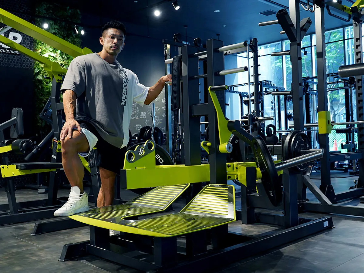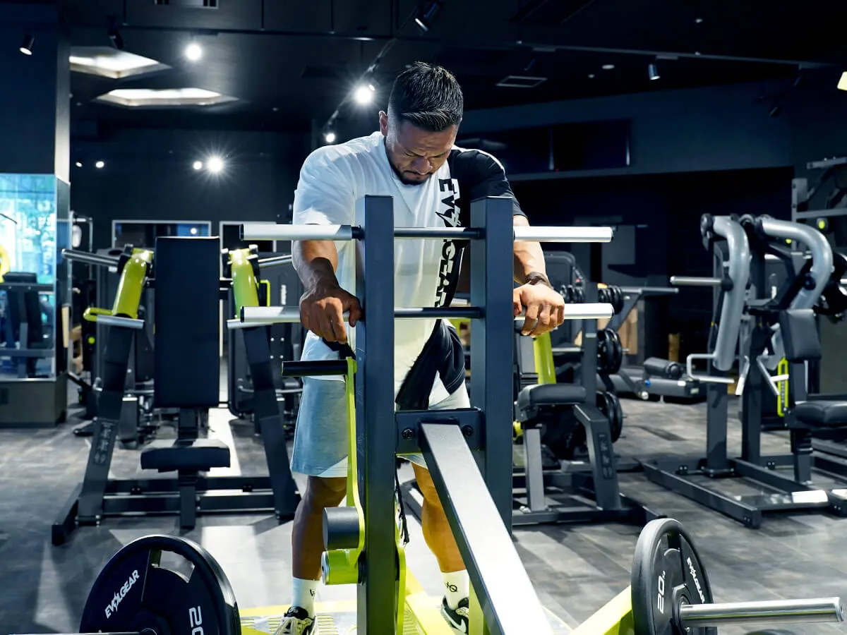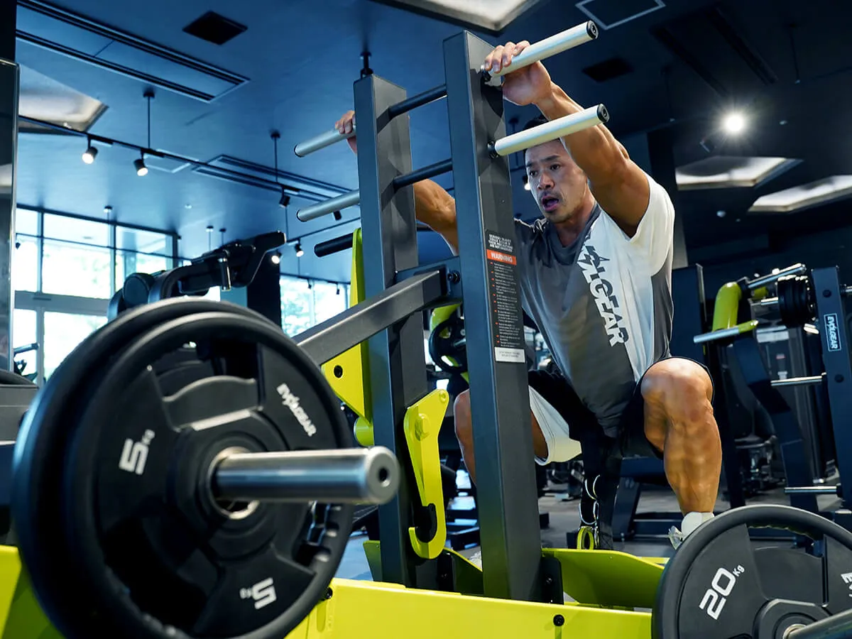 このマシン、正直言って僕はめちゃくちゃ好きです。というのも、スクワットの軌道は固定されているんですけど、軌道に合わせて足のポジションを自分で決められる。そして膝への負担がすごく少ない状態でトレーニングができます。また、上半身の姿勢に関しても、バーを担ぐ時は体勢的にどうしても姿勢が決まっちゃうんですけど、このマシンはそれがない。身体を立てたり、あえてちょっと前傾姿勢にしたりとバリエーションもすごく豊富に出来ます。グリップがあるので安定して動かせるっていうのも良い所ですし、最後の追い込みとして手でサポートしながら追い込んだりも出来る。自分は本当にこのマシンを使った瞬間に気に入りました。スクワットマシンは各種それぞれ良さがありますが、このマシンは膝への負担が少なくて、何も考えずにスクワットが出来る。それでいて四頭筋への負荷が少ないわけでもない。これが一番いい所ですね。