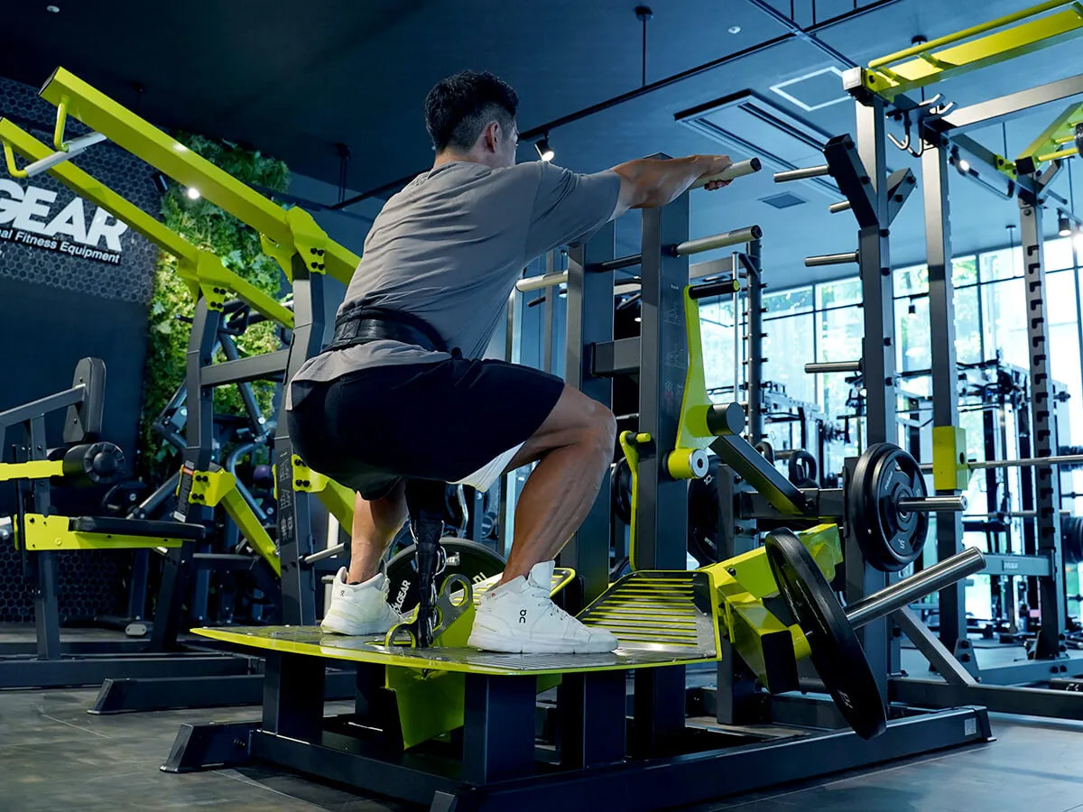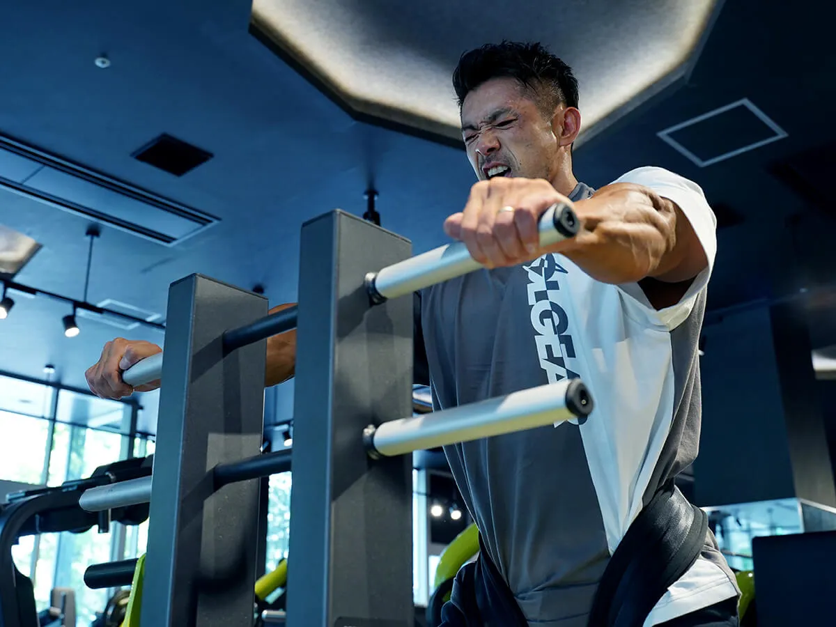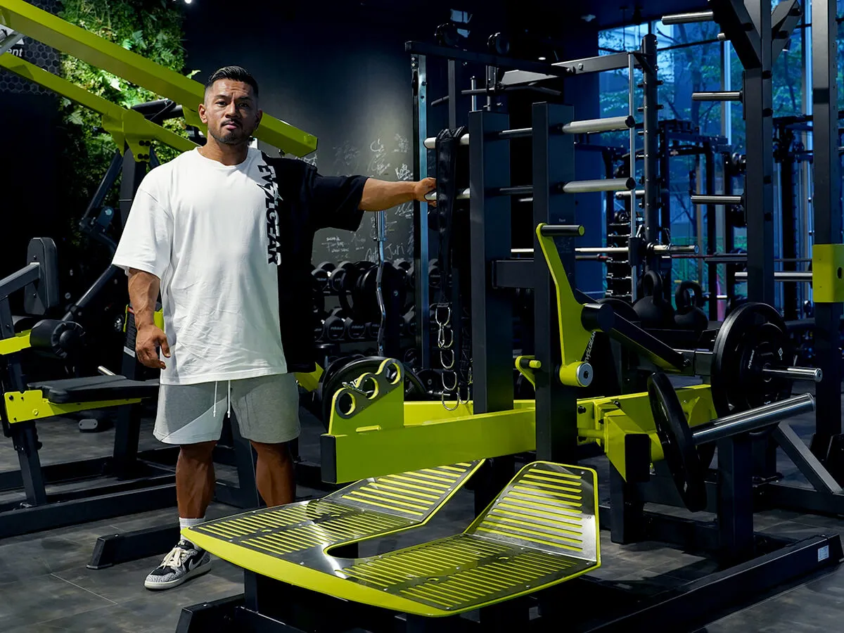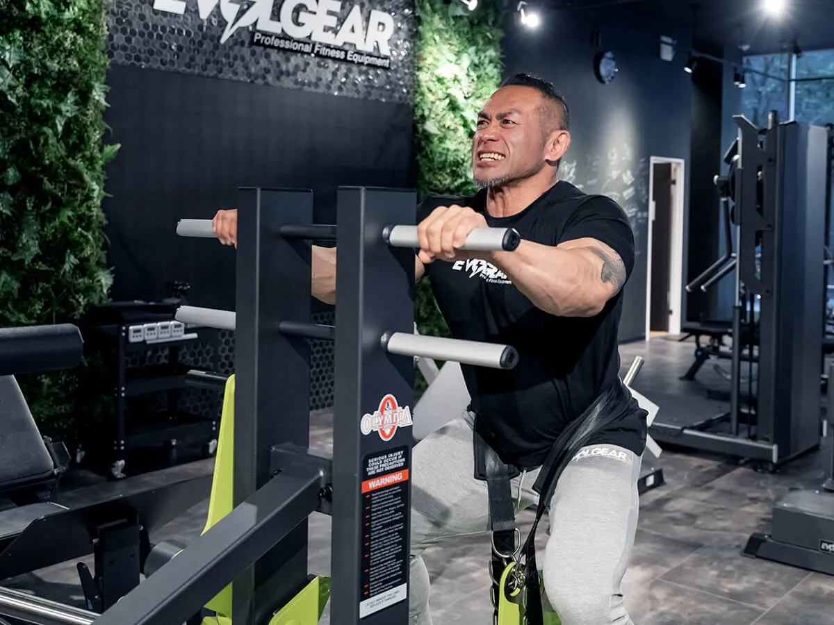 このマシン、正直言って僕はめちゃくちゃ好きです。というのも、スクワットの軌道は固定されているんですけど、軌道に合わせて足のポジションを自分で決められる。そして膝への負担がすごく少ない状態でトレーニングができます。また、上半身の姿勢に関しても、バーを担ぐ時は体勢的にどうしても姿勢が決まっちゃうんですけど、このマシンはそれがない。身体を立てたり、あえてちょっと前傾姿勢にしたりとバリエーションもすごく豊富に出来ます。グリップがあるので安定して動かせるっていうのも良い所ですし、最後の追い込みとして手でサポートしながら追い込んだりも出来る。自分は本当にこのマシンを使った瞬間に気に入りました。スクワットマシンは各種それぞれ良さがありますが、このマシンは膝への負担が少なくて、何も考えずにスクワットが出来る。それでいて四頭筋への負荷が少ないわけでもない。これが一番いい所ですね。