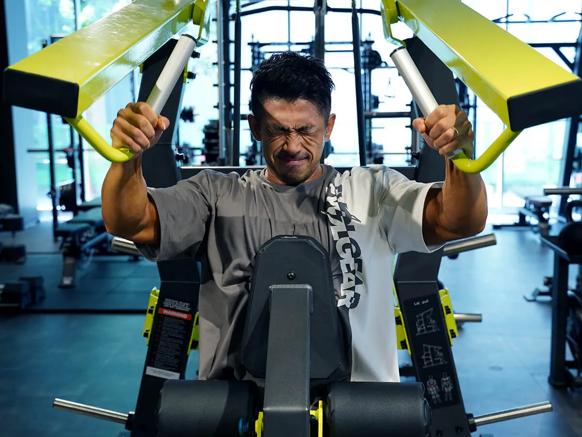 このマシンは身体の前方、斜め前から後方に引くんですけど、肩甲骨の動きが非常に大きく取れて背中の広背筋・僧帽筋にすごく力が入れやすい。また僕がすごい良いと感じたのはグリップの角度で、ハの字になっているので肩がすくみづらい。肩をしっかり落として引くことができるアングルになっているんですね。なので広背筋上部に非常に刺激が入れやすかったです。そしてもちろんシートの位置を変えることで自分の狙いたい箇所を調整できますし、背中のトレーニングとしては良いバリエーションになると思いました。ツーハンドでも出来ますし、アームが独立して片方ずつ動きますからワンハンドでより大きく広背筋を使うことも出来ます。両手だとどうしても背骨の動きが小さくなってしまうので、背中の感覚を意識しづらいっていう方もいるんですが、そんな方もワンハンドでやることによって意識しやすくなると思う。非常に優れたマシンだと思います。