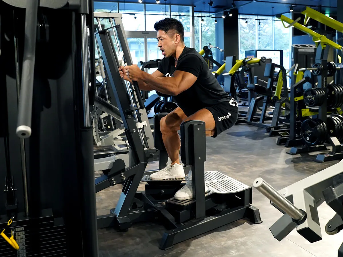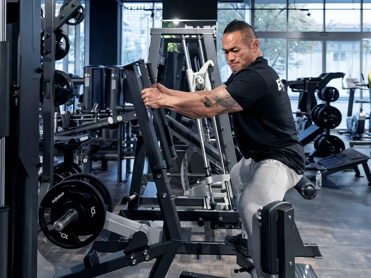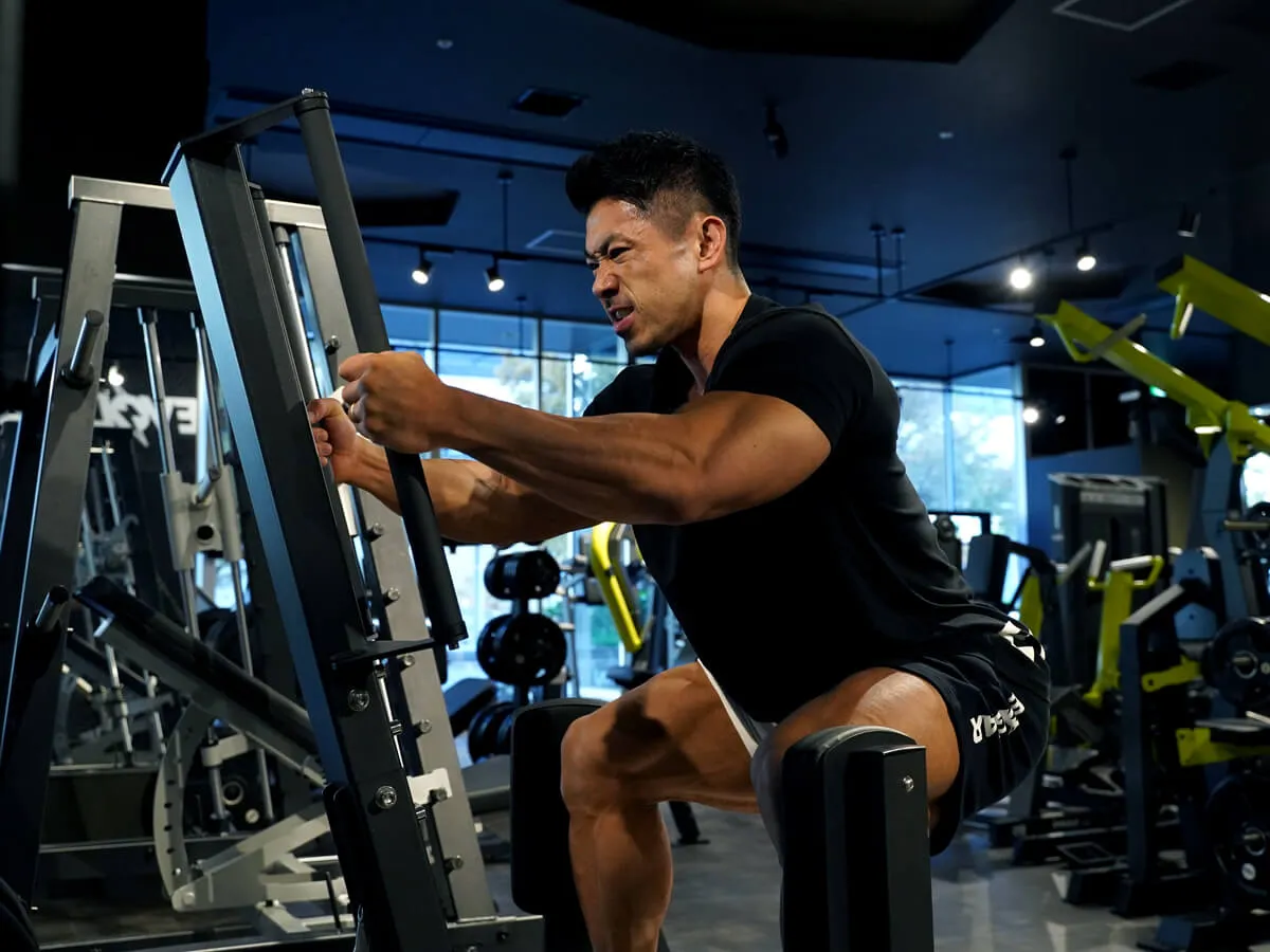 このマシンは本当にお尻が千切れそうなぐらい効きます。やっぱりスタンディングで出来るっていうことが大きな特徴で、今までなかったマシンですね。従来だとシートに座って動かすマシンが主流でしたが、中腰姿勢で行うことで初動からお尻の筋肉にスイッチが入っている感覚です。そしてその状態で動かし続けるので、めちゃくちゃお尻に効きますね。また上半身をサポートするためのグリップも、幅広く設計されているので身長に合わせて握りやすく、面倒な調整もなく、そのままバーを握って中腰になって足を開くだけ。しかも軌道もちゃんと股関節の動きに合わせて開くようになってるので、本当にトレーニングしやすいマシンです。