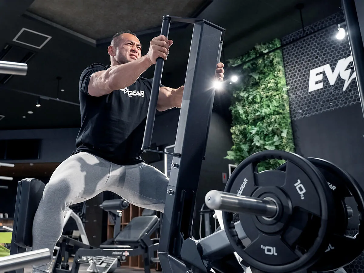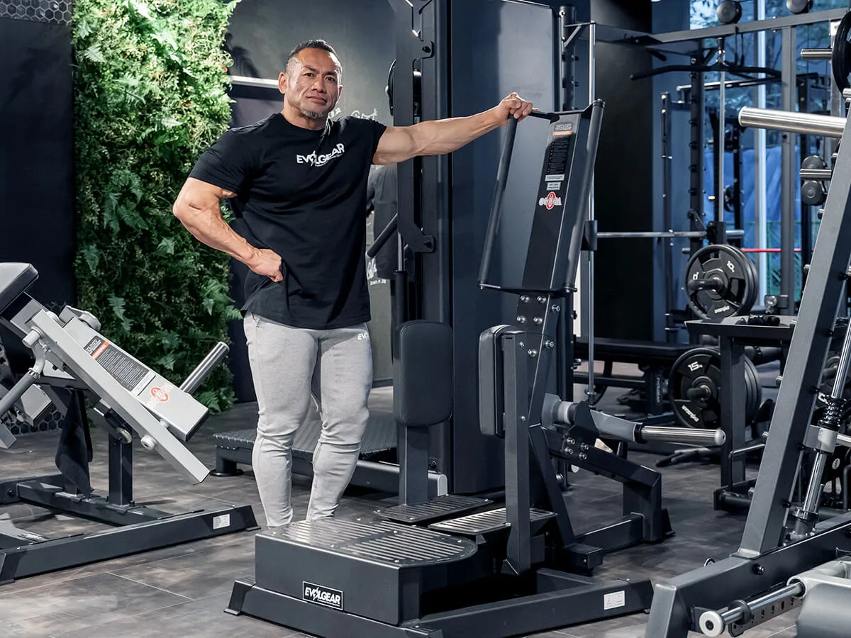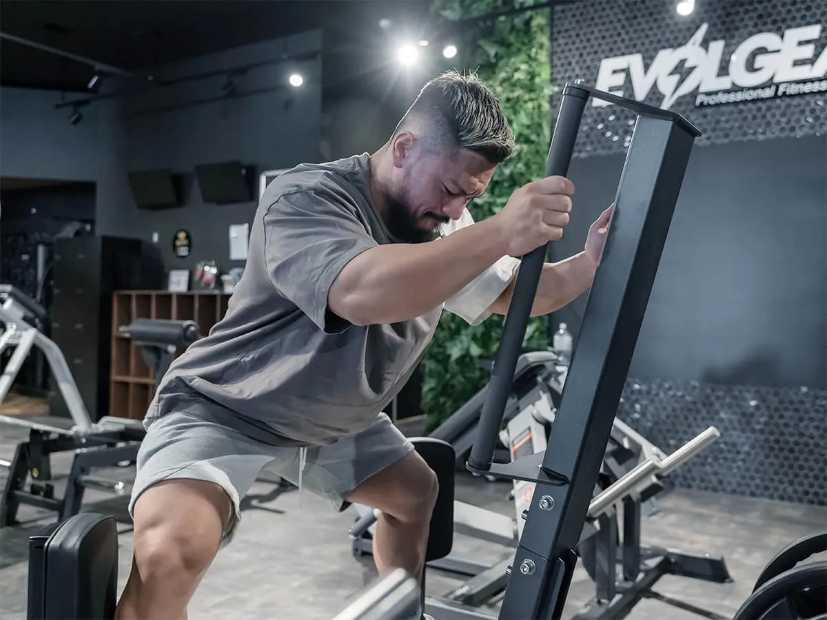 このマシンは本当にお尻が千切れそうなぐらい効きます。やっぱりスタンディングで出来るっていうことが大きな特徴で、今までなかったマシンですね。従来だとシートに座って動かすマシンが主流でしたが、中腰姿勢で行うことで初動からお尻の筋肉にスイッチが入っている感覚です。そしてその状態で動かし続けるので、めちゃくちゃお尻に効きますね。また上半身をサポートするためのグリップも、幅広く設計されているので身長に合わせて握りやすく、面倒な調整もなく、そのままバーを握って中腰になって足を開くだけ。しかも軌道もちゃんと股関節の動きに合わせて開くようになってるので、本当にトレーニングしやすいマシンです。