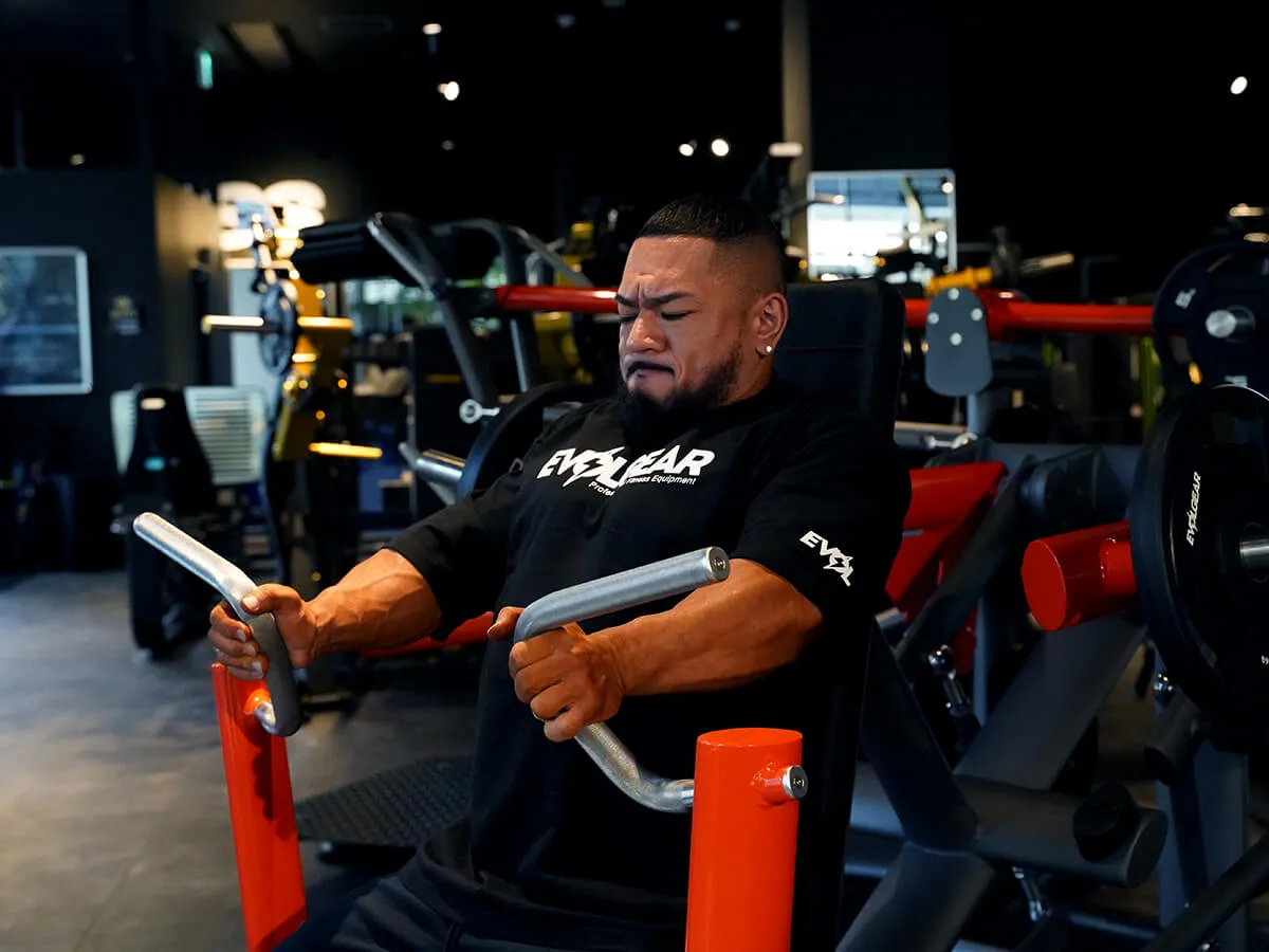 このマシンはフットペダルがついているんですが、他のマシンだと短くて踏みにくいフットペダルもあるんですが、このマシンは長く設計されていて踏みやすいです。そしてこれによりグリップを自分の身体の近くまで寄せることができます。マシンの動作としてはデクラインに対してダイレクトにアプローチできるような動き。可動時に内側に入って最大収縮を得られるような軌道になっています。そしてグリップがギザギザした形状のグリップなので、動作中も滑ることなくしっかりとホールドしてくれて、集中して胸の収縮ができるマシンとなっております。またTシリーズ特有のカラーリングと高級感のあるシートも良いですね。さらにこのシリーズの特徴でもある、長いプレートホーンによってプレートがたくさん装着できるのでヘビなートレーニングも可能です。プレートの動きが垂直に動きますので負荷が逃げることなく、どのポジションでもダイレクトに刺激が入ってくる優れたデクラインのマシンだと思います。