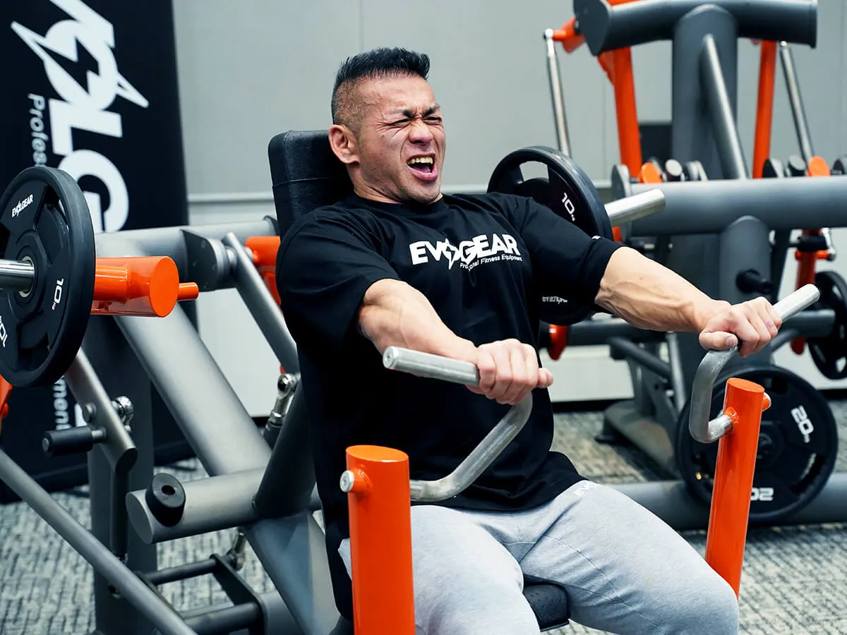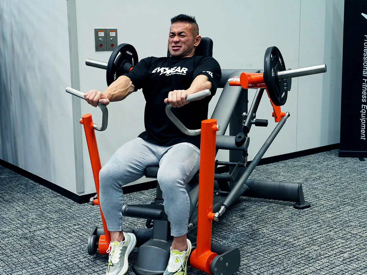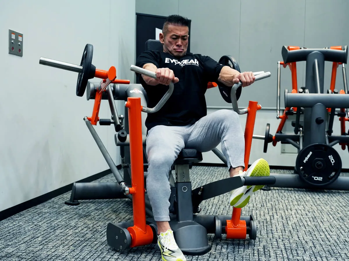 このスーパーデクラインチェストプレス、まずはグリップを見てもらうと、横と縦の2方向でグリップすることができす。これによりバリエーションとしてニュートラルにしたり通常のチェストプレスの動作で行ったりできて、これだけで胸筋下部2種の動きができます。フライプレスのようにもできるし、通常のプレスのようにもできるという点ですごく良い。また可動域も大きいので最初のセットポジションが大変かなと思うんですが、フットペダルがついているのでこれをぐっと押し込めば、グリップ部分が前に出てきて最初のセットが非常にしやすくなります。このマシンは負荷が抜けづらいので、ボトムでも収縮ポジションでも負荷が入り続けます。先程使った時もずーっと負荷が抜けないので、すごくきついです。特に競技者にとっては、このマシンがあると大胸筋下部の膨らみが強化できる最高のマシンだと言えます。