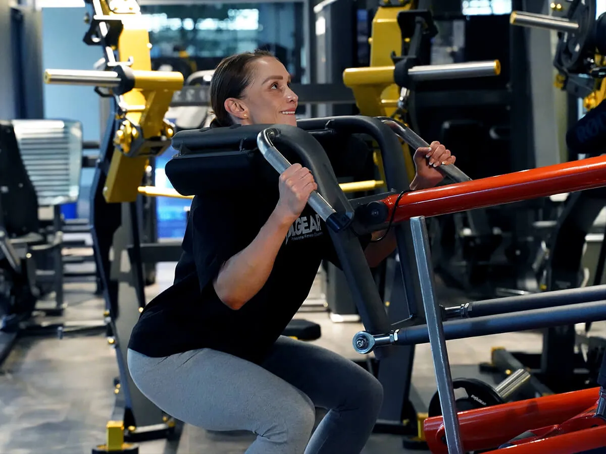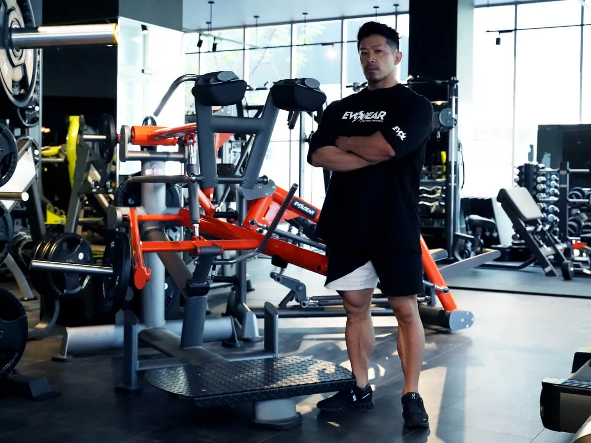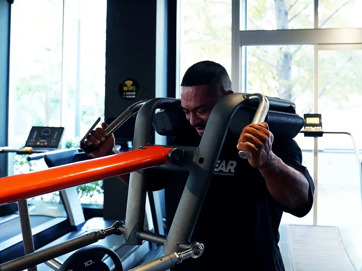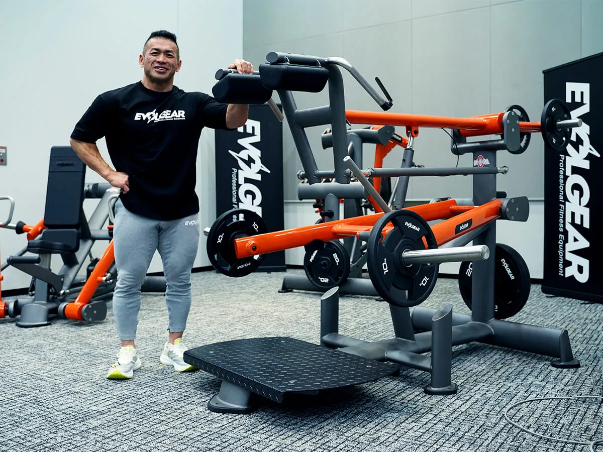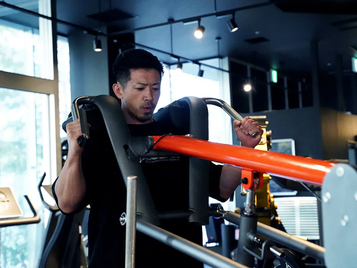 このマシンが従来のマシンと違うところは、脚とお尻の筋肉に対してまっすぐ垂直に刺激が入るという点です。そして一番の特徴はカウンターウェイトをつけることができる所で、シーソーのようにカウンターウェイトをつけるほど負荷が軽くなるため、女性や年輩の方でも安全にトレーニングできるように作られています。もちろんカウンターウェイトを外すしてハードにトレーニングすることも可能です。またこのマシンはグリップに搭載されたレバーを握ると、スタートポジションの高さを5段階で調節することが可能なので色んな身長の方が使うことができます。そして冒頭にもお話した通り、刺激が垂直に入る。円を描いた軌道ではなく垂直にしっかりと筋肉へ刺激が当たるので、一般の方から競技者まで幅広く使えるマシンだと感じました。