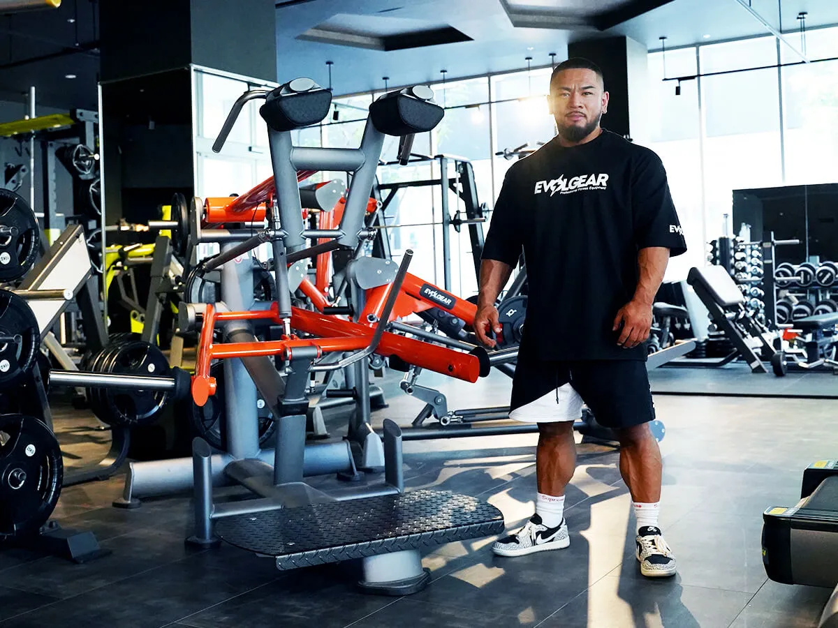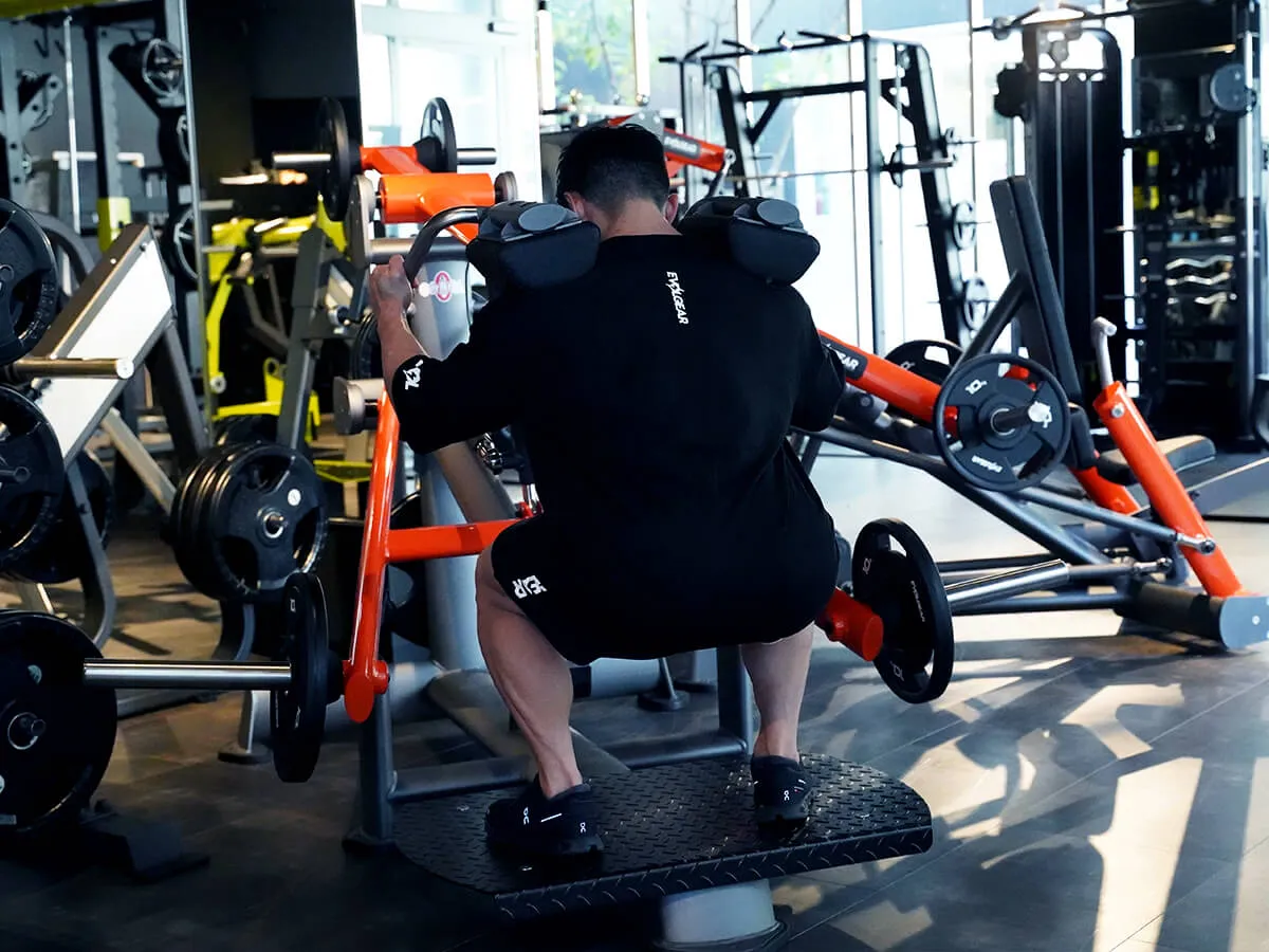 このマシンの一番大きな特徴はカウンターウェイトがつけられることです。カウンターウェイトにプレートを多くつけるとこれが補助の役割になっています。そもそもウェイトを乗せなくても重たいマシンということもあり、初心者や女性の方でもカウンターウェイトを活用することで安心して使えるマシンとなっています。もちろんハードトレーニングも可能で、プレートホーンが長く設計されているのでプレートをたくさん装着することもできます。また、Tシリーズのマシンは共通してカラーリングと高級感のあるシートが目を引きますね。さらにスターティングポジションの高さも5段階調節できるので、小柄な方でもハムストリングスやカーフがびったりくっつくまで深くしゃがめるようようになっています。このマシンを使って通常のツーレッグスクワットは勿論のこと、ワンレッグのランジもできる優れたマシンです。もう一点気付いた点としては、マシンの軌道が本当に垂直に動いて無駄な動きがない。たまに体が後ろに下がってしまうような軌道のマシンもあるのですが、これはそういうこともなくて腰に負担なく四頭筋・ハムストリングス・大殿筋にしっかりウェイトを乗せた状態で上下運動ができるマシンなので、筋肥大に大きな期待ができるマシンだと思いました。