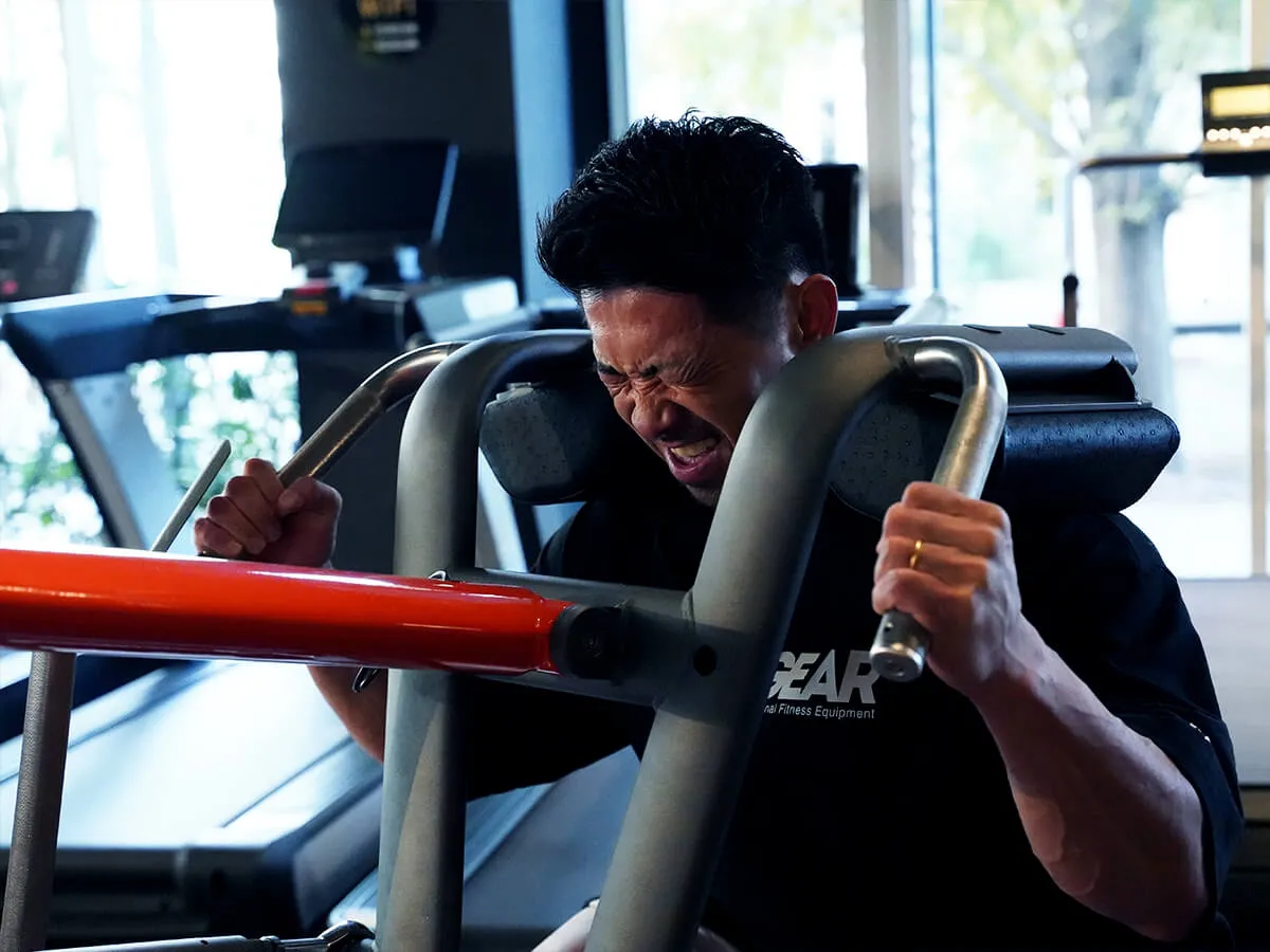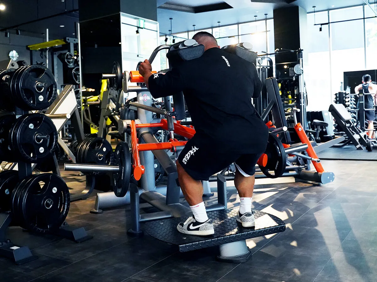 こちらのスーパースクワットマシンはその名の通りスクワット、脚のトレーニングができるマシンです。このマシンのすごく良いところは肩のパッドがすごく分厚いので、重さをかけたときも安定して力が入りやすい点。そしてグリップ部分のトリガーを握ることでスタートポジションの高さが5段階で調整できます。身長に合わせて調整したり、また可動域を深くしたり浅くしたりという調整に便利な機能です。そしてストッパーがついていますので、レップできなくなったら手前のバーを引いてストッパーを戻せば安全にトレーニングを終えることができます。プレートを装着するホーンは手前と奥の2箇所。このマシンは終止負荷が抜けないので、負荷がきついという場合は奥のホーンにカウンターウェイトを装着すると、軽い重量でトレーニングできるようになるため初心者もトレーニングしやすく工夫されています。手前のプレートホーンはプレートを多く付けられるようになっていますので、高重量でトレーニングしたい方、初心者から上級者まで幅広い人達におすすめできる優れたマシンです。