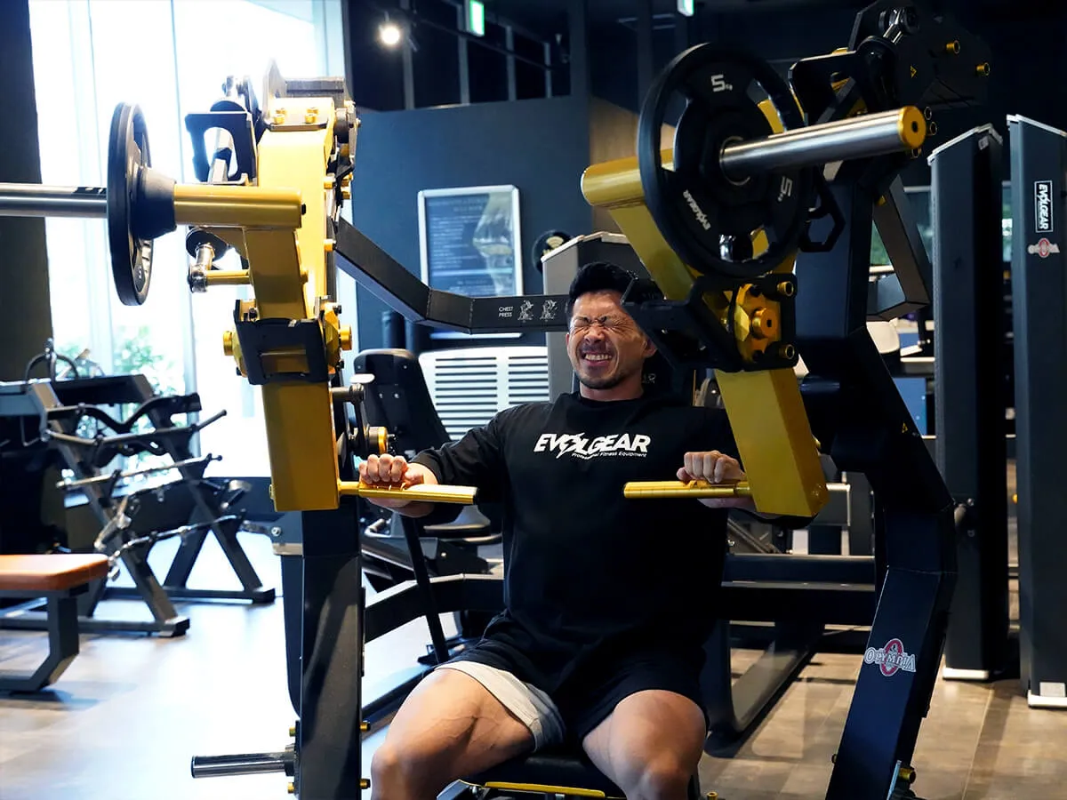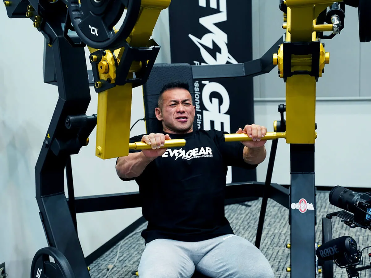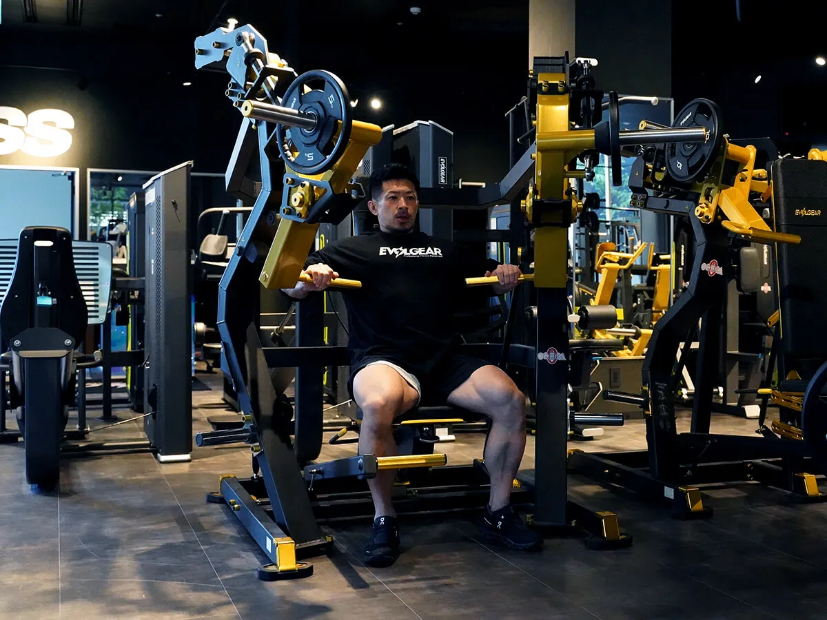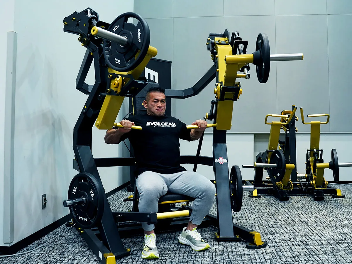 EVOLGEARの新たなプレートロード“Z”シリーズ。チェストプレスの特徴は、まず背もたれのシートが前後ろに調整できること。これで可動域の調整が可能になります。体型に合わせて、最初のポジションをセットできるのも嬉しいですね。さらにシートポジションの調整も可能。高さを合わせることで狙いたい部位、効きやすいポジションにセットが可能です。またアシストがついてますので、最初のスタートポジションが非常にやりやすくなっています。非常に負荷が抜けにくく、常に胸にテンションがかかっていく軌道になっていて、本当に大胸筋にダイレクトに入ってくる。非常に使いやすいマシンです。