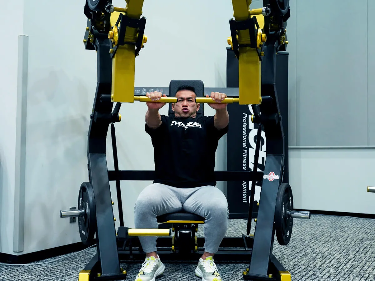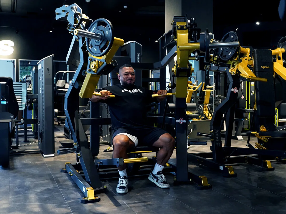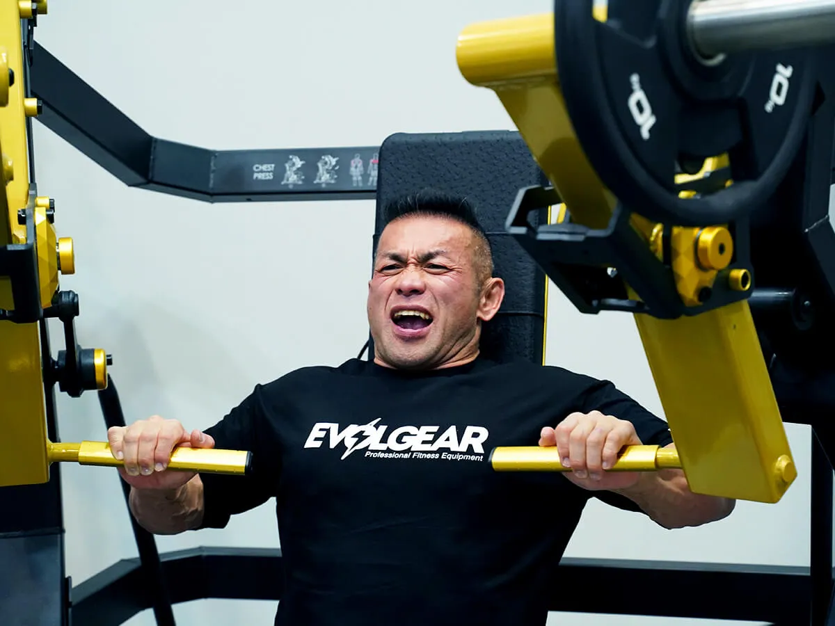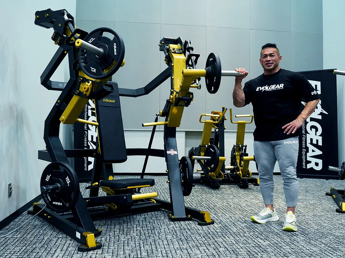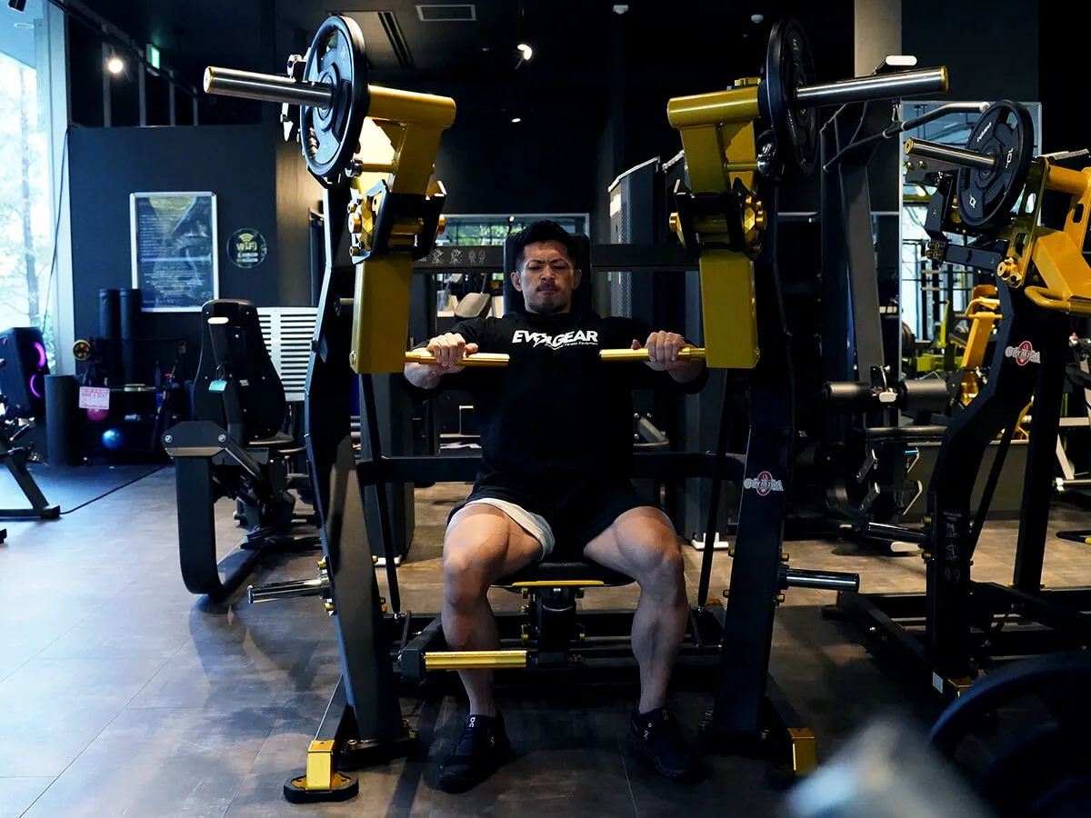 EVOLGEARの新たなプレートロード“Z”シリーズ。チェストプレスの特徴は、まず背もたれのシートが前後ろに調整できること。これで可動域の調整が可能になります。体型に合わせて、最初のポジションをセットできるのも嬉しいですね。さらにシートポジションの調整も可能。高さを合わせることで狙いたい部位、効きやすいポジションにセットが可能です。またアシストがついてますので、最初のスタートポジションが非常にやりやすくなっています。非常に負荷が抜けにくく、常に胸にテンションがかかっていく軌道になっていて、本当に大胸筋にダイレクトに入ってくる。非常に使いやすいマシンです。