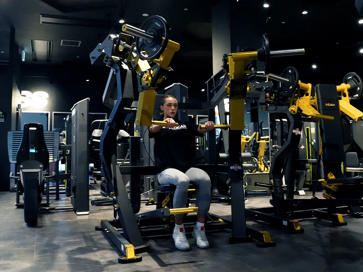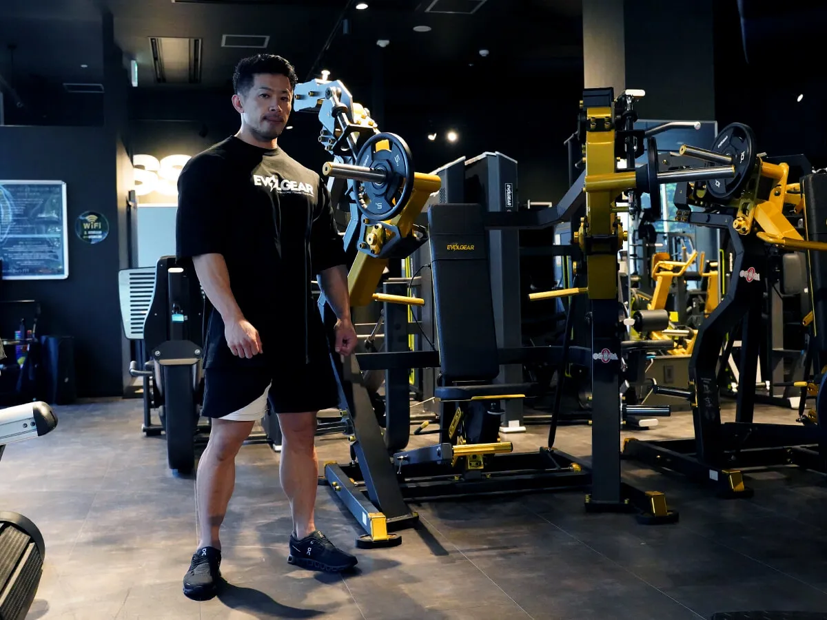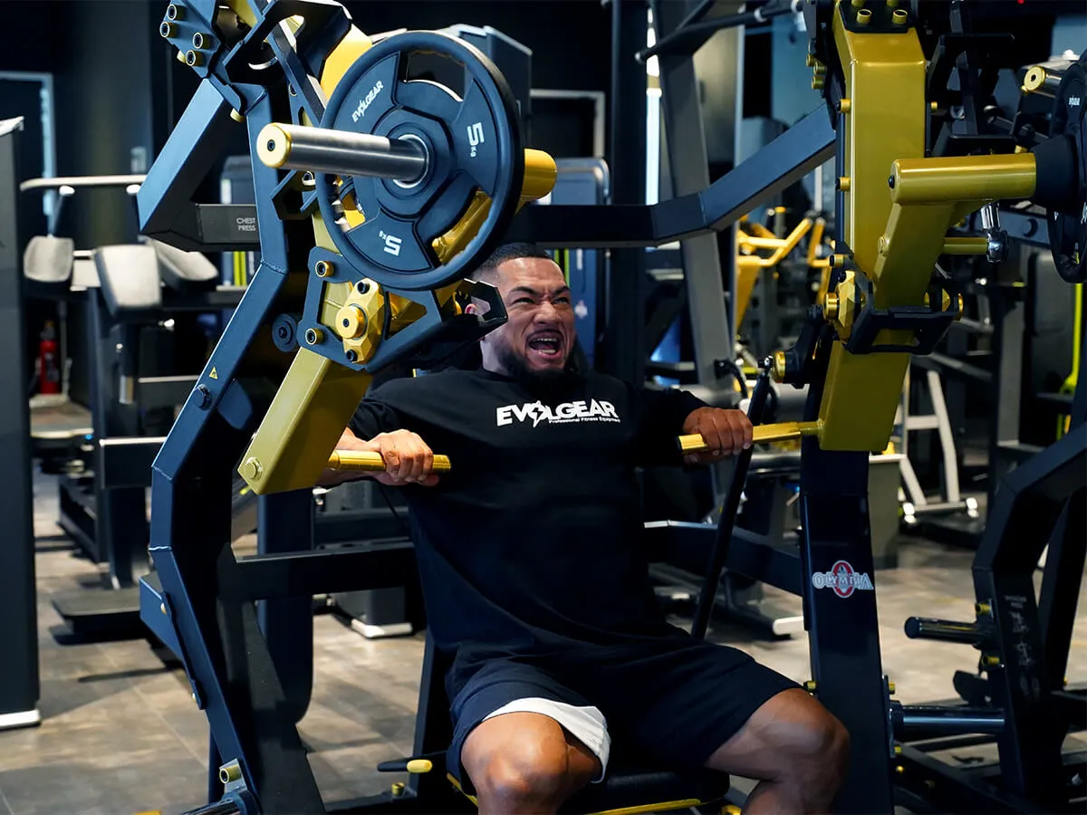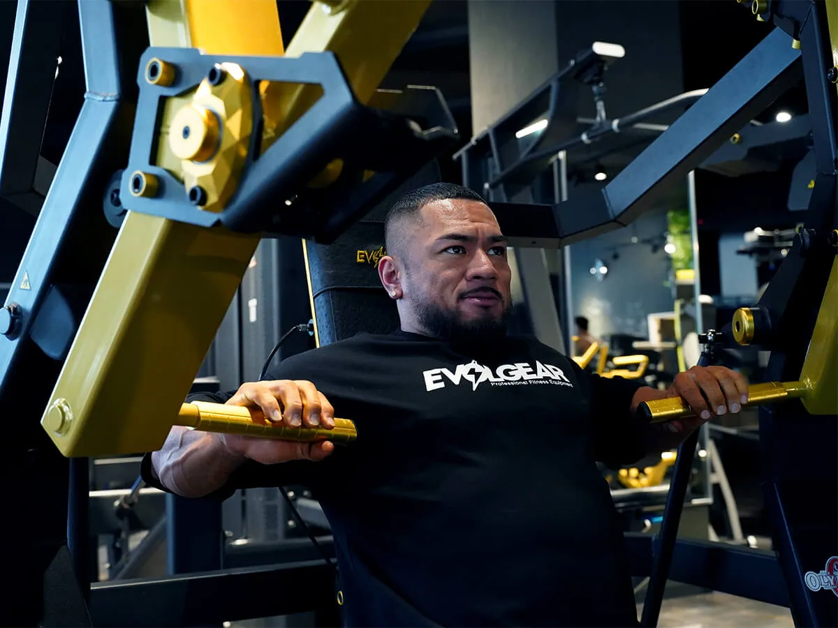 EVOLGEARの新たなプレートロード“Z”シリーズ。チェストプレスの特徴は、まず背もたれのシートが前後ろに調整できること。これで可動域の調整が可能になります。体型に合わせて、最初のポジションをセットできるのも嬉しいですね。さらにシートポジションの調整も可能。高さを合わせることで狙いたい部位、効きやすいポジションにセットが可能です。またアシストがついてますので、最初のスタートポジションが非常にやりやすくなっています。非常に負荷が抜けにくく、常に胸にテンションがかかっていく軌道になっていて、本当に大胸筋にダイレクトに入ってくる。非常に使いやすいマシンです。