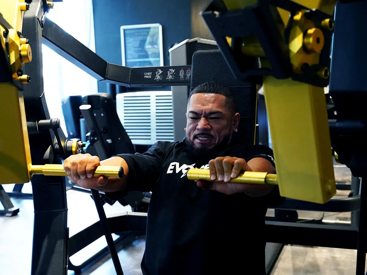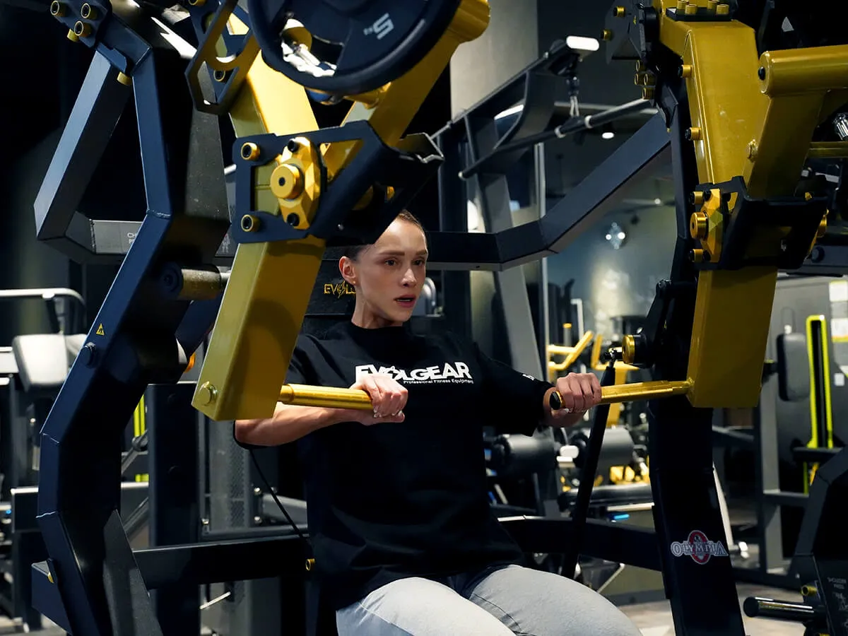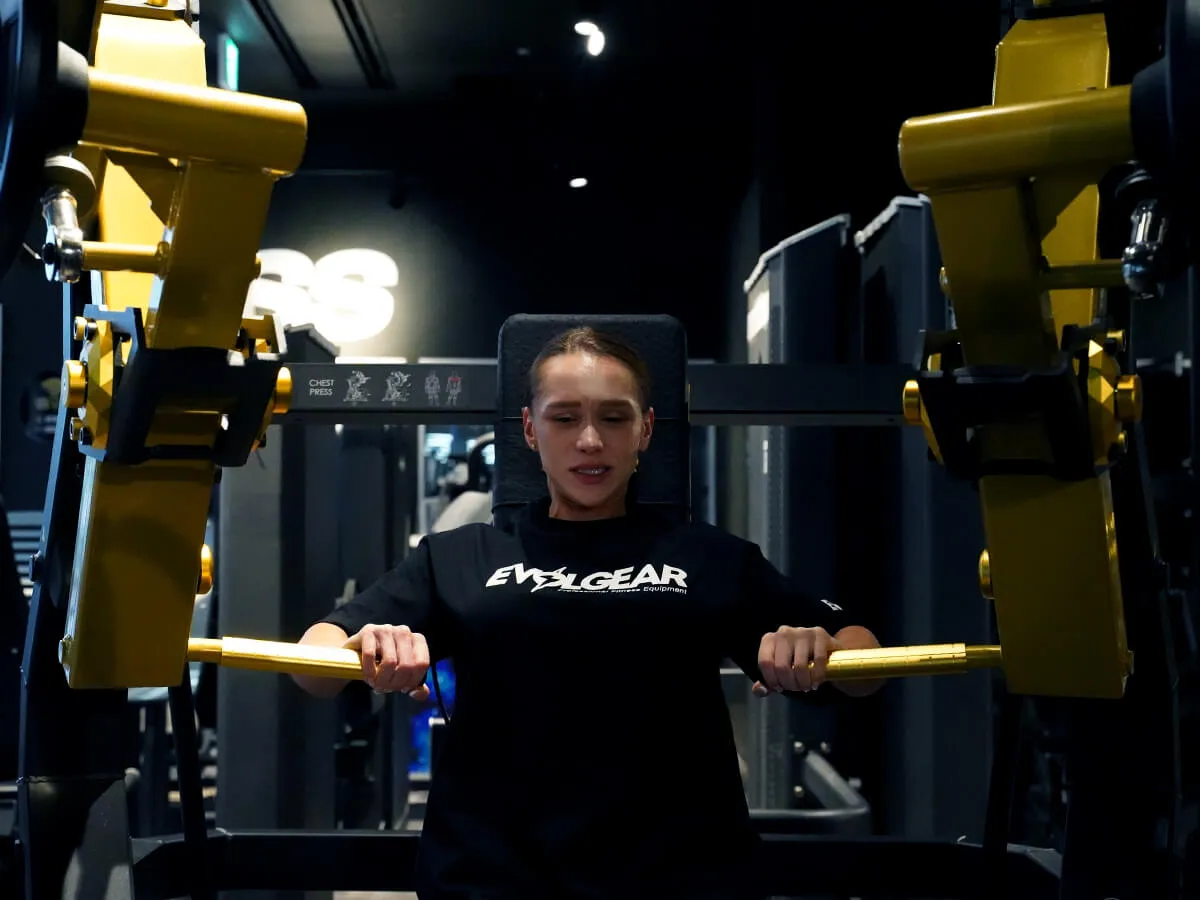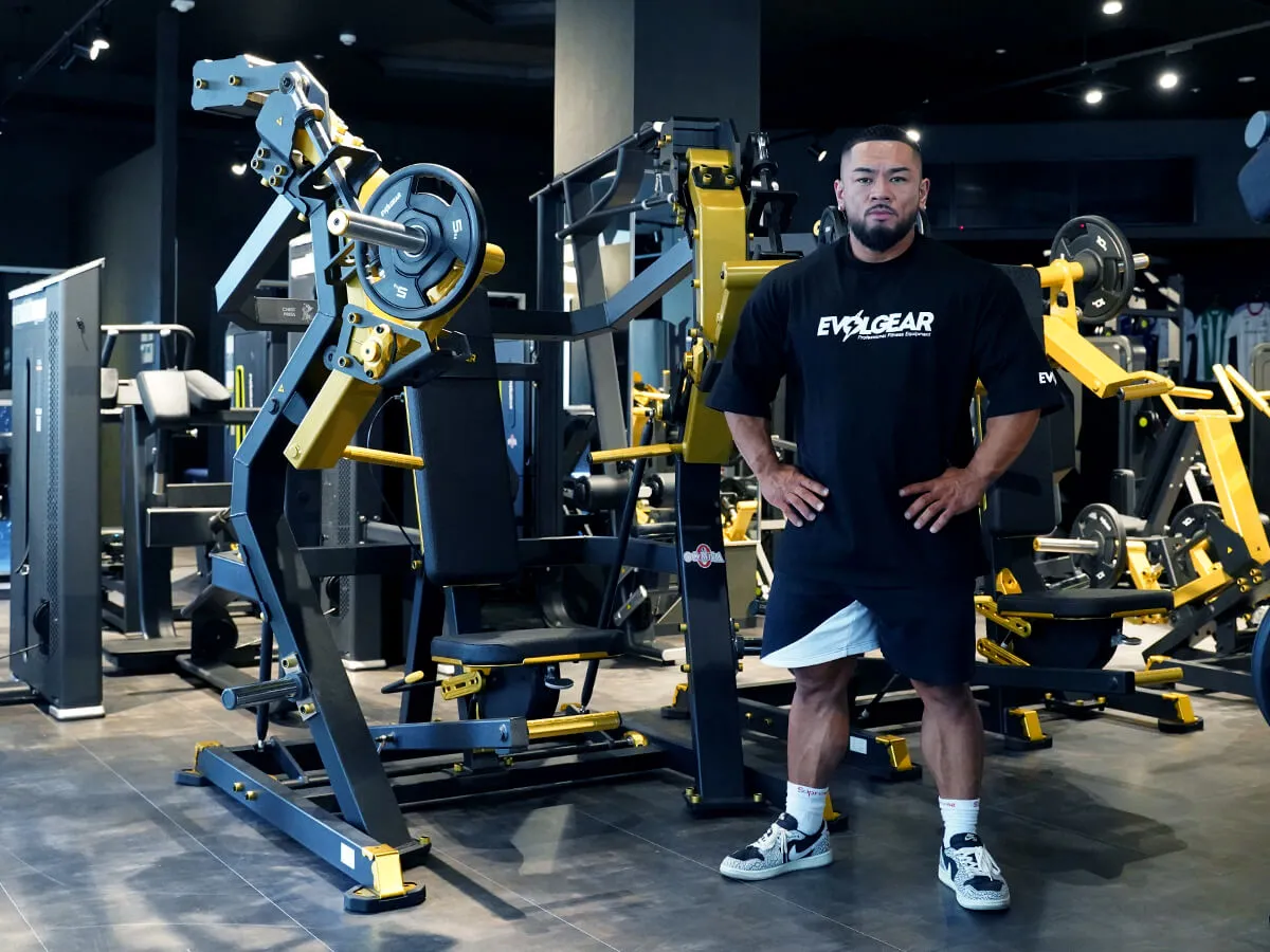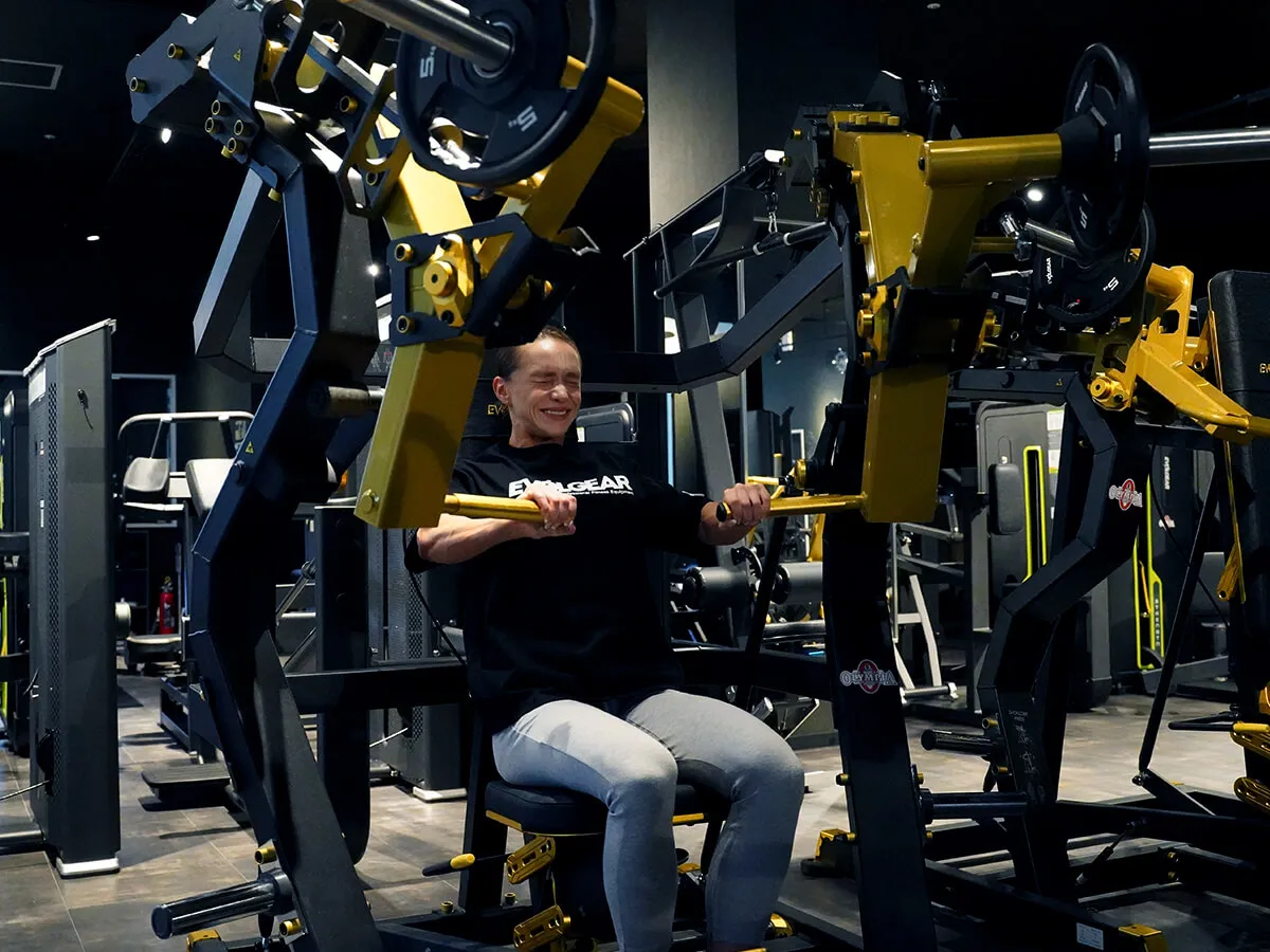 EVOLGEARの新たなプレートロード“Z”シリーズ。チェストプレスの特徴は、まず背もたれのシートが前後ろに調整できること。これで可動域の調整が可能になります。体型に合わせて、最初のポジションをセットできるのも嬉しいですね。さらにシートポジションの調整も可能。高さを合わせることで狙いたい部位、効きやすいポジションにセットが可能です。またアシストがついてますので、最初のスタートポジションが非常にやりやすくなっています。非常に負荷が抜けにくく、常に胸にテンションがかかっていく軌道になっていて、本当に大胸筋にダイレクトに入ってくる。非常に使いやすいマシンです。
