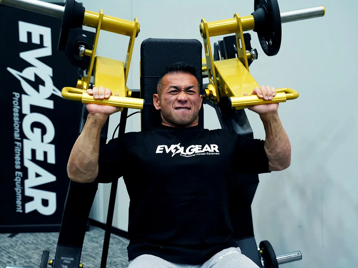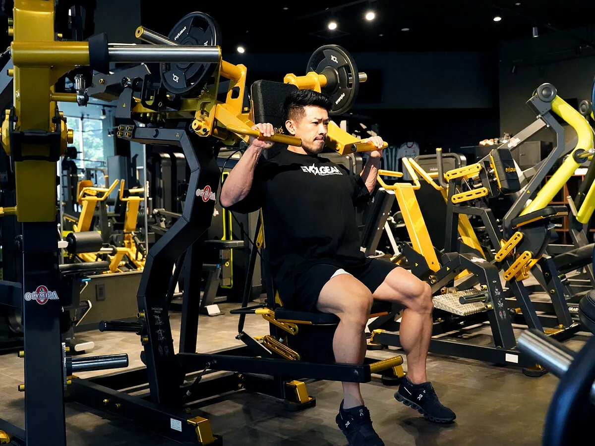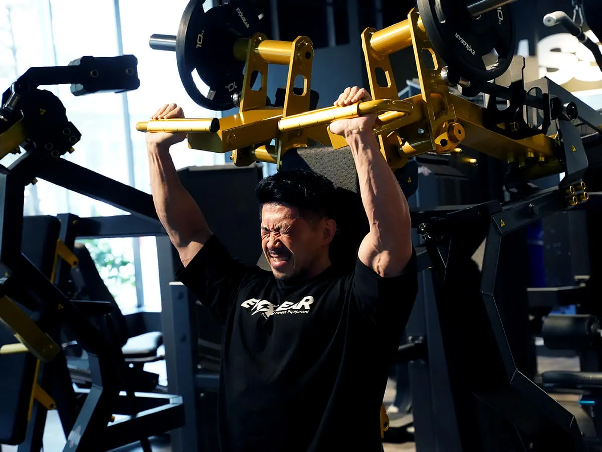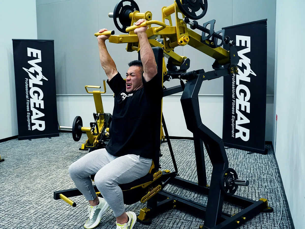 このショルダープレスは、まずZシリーズの共通点であるフットペダルがあることによりアームが手前に押し出されるため、関節を傷めずにスタートポジションを作りやすい点が良いと思いました。そしてウェイトの負荷が垂直にかかることでしっかり収縮と伸展をかけられるので、負荷が抜けないという点もとても良いですね。グリップはファットグリップになっているので使いやすく、掴んだときの感触も手に優しい感じです。背面と座面シートはどちらも調節が可能なので、どんな体型の方でも同じようにマシンが利用でき、トレーニングを楽しめると思います。Zシリーズは共通してデザインが非常にかっこよくて、シートの素材感・質感も自分好みなので、そういったマシン自体のビジュアルの良さもきっとモチベーションに繋がると思います。
