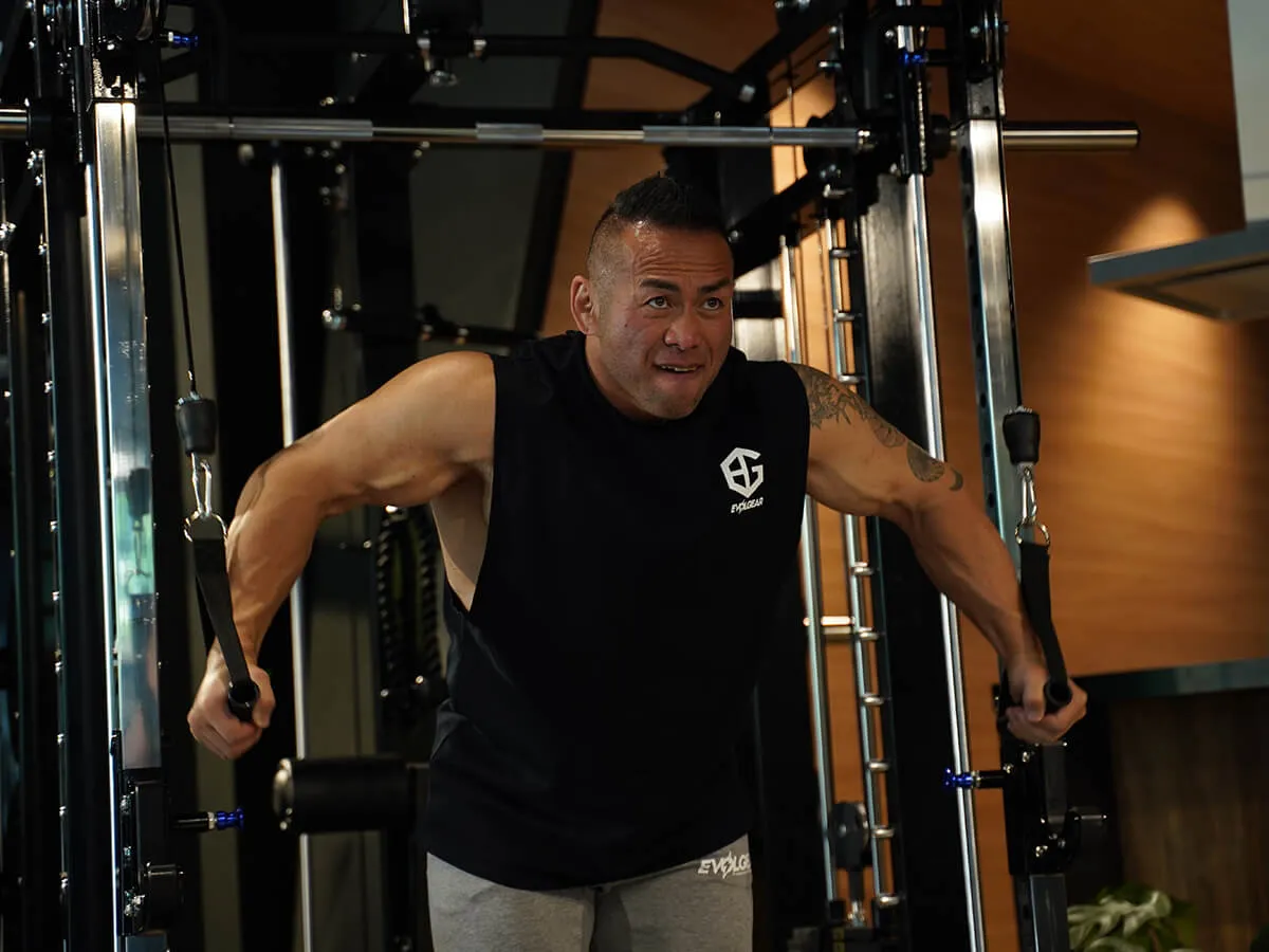 この一台でパワーラック、ケーブル、ラットマシン、チンニング、ディップス、Tバーがセットになっていて全身のトレーニングができる。普通のマルチラックのケーブルはプレートを取り付けるタイプだが、これはウェイトスタックが付いていてスムーズ。しかも細かいところでいうと、滑車部分がメタル製なのでスムーズ感に一役買ってる。ケーブルの上下への高さ調節が一つ一つ細かくできるのでハイプーリーからロープーリー、ミドルもできる。スミスでスクワットを試したが、マルチラックには珍しくカウンターウェイト機能が付いていて、ちょっと軽くなってるんだよね。だから初心者でも安全に安心して使える。それにグリップのローレットがしっかりしてるので手が滑らない。