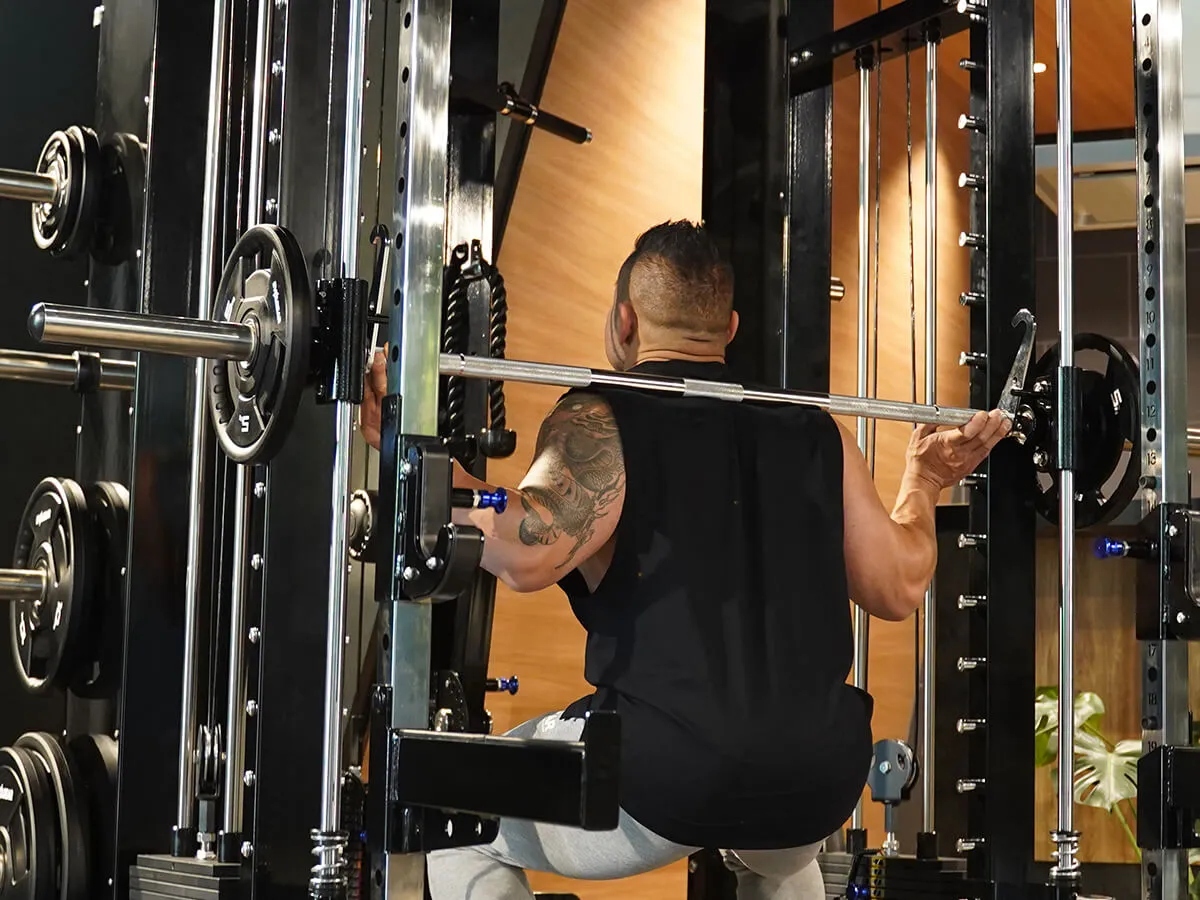 スミスマシンには従来の製品には無かった、カウンターウエイトを設置した事で、初心者の方や女性の方でも安心して使用出来ます。