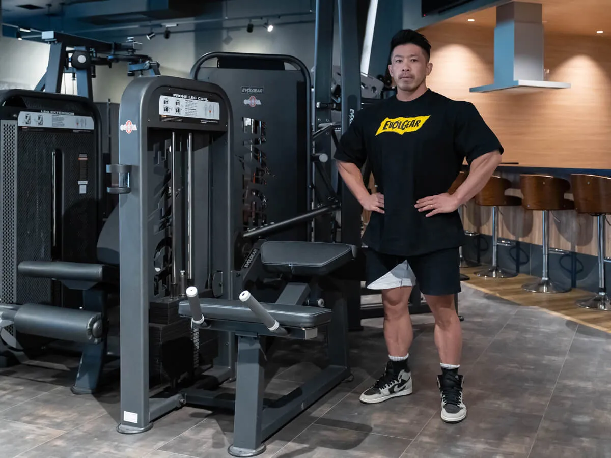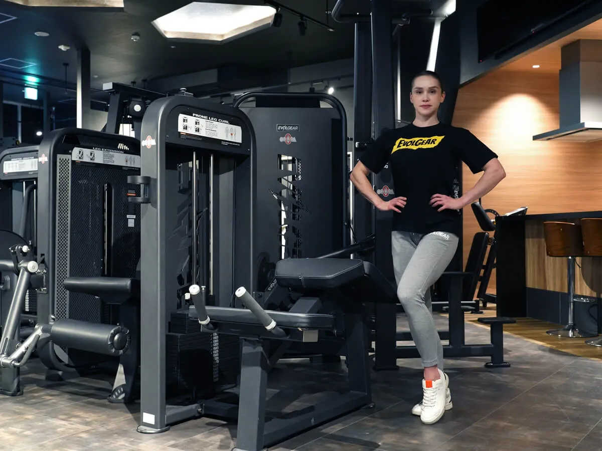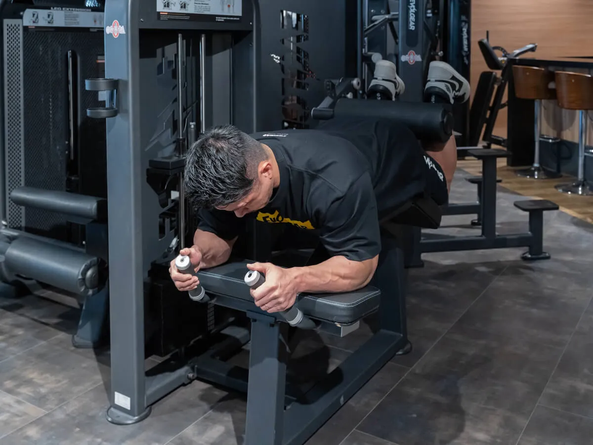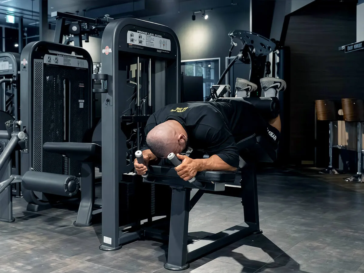 EVOLGEARのプローンレッグカール。特徴的なのは、その独自の形状とポジション設計です。寝転がった際の肘から腰の位置関係が山なりになっており、動作中に腰への負担がほとんどかからない構造になっています。一般的なライイングレッグカールでは腰に負担が出やすいものもありますが、このマシンでは安心して動作が可能です。グリップはラバー仕様で、しっかり握れるため安定感も抜群。動作中に重要なグリップ力をしっかりサポートしてくれます。さらに、足を支えるパッドは回転式になっており、引っかかりなくスムーズな動作が可能です。特に印象的なのは、パッドの動き。通常はくるぶしより上にずれてしまうケースも多いのですが、このマシンは一定のポジションをしっかり維持できるため、ストレスなくトレーニングに集中できます。また、パッドの位置は約15cmの範囲で調整可能。小柄な女性から大柄な男性まで、幅広いユーザーに対応できる汎用性を備えています。腰への負担を抑えつつ、スムーズで快適な動作ができる、非常に使いやすいマシンです。