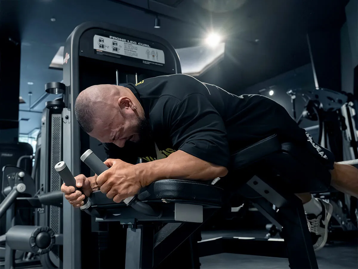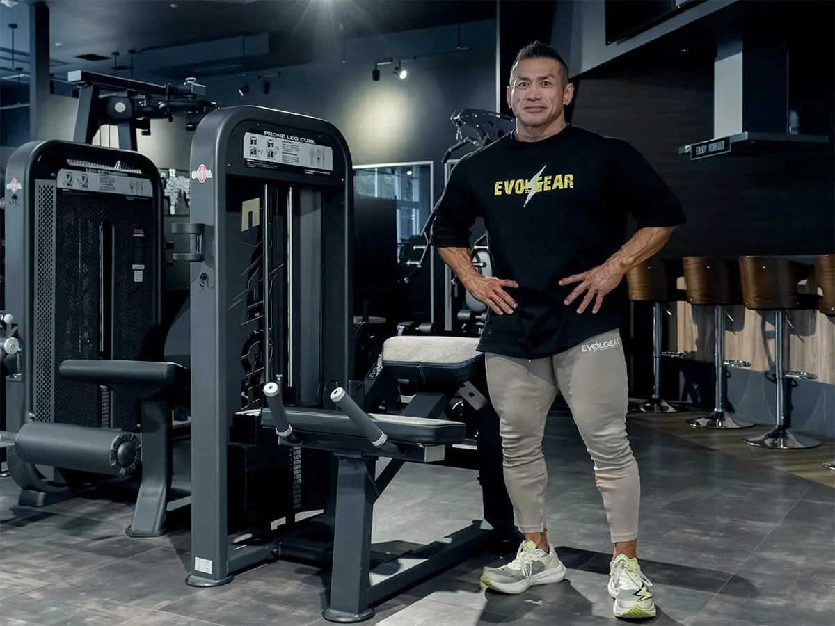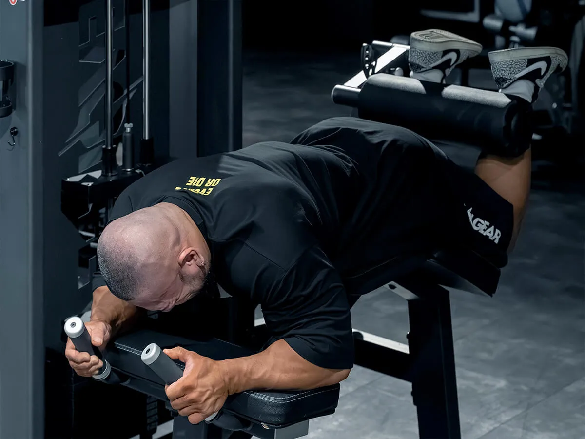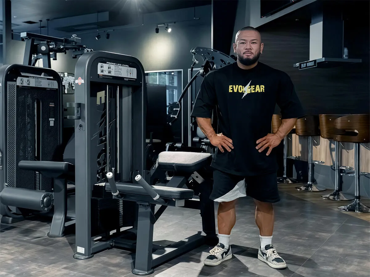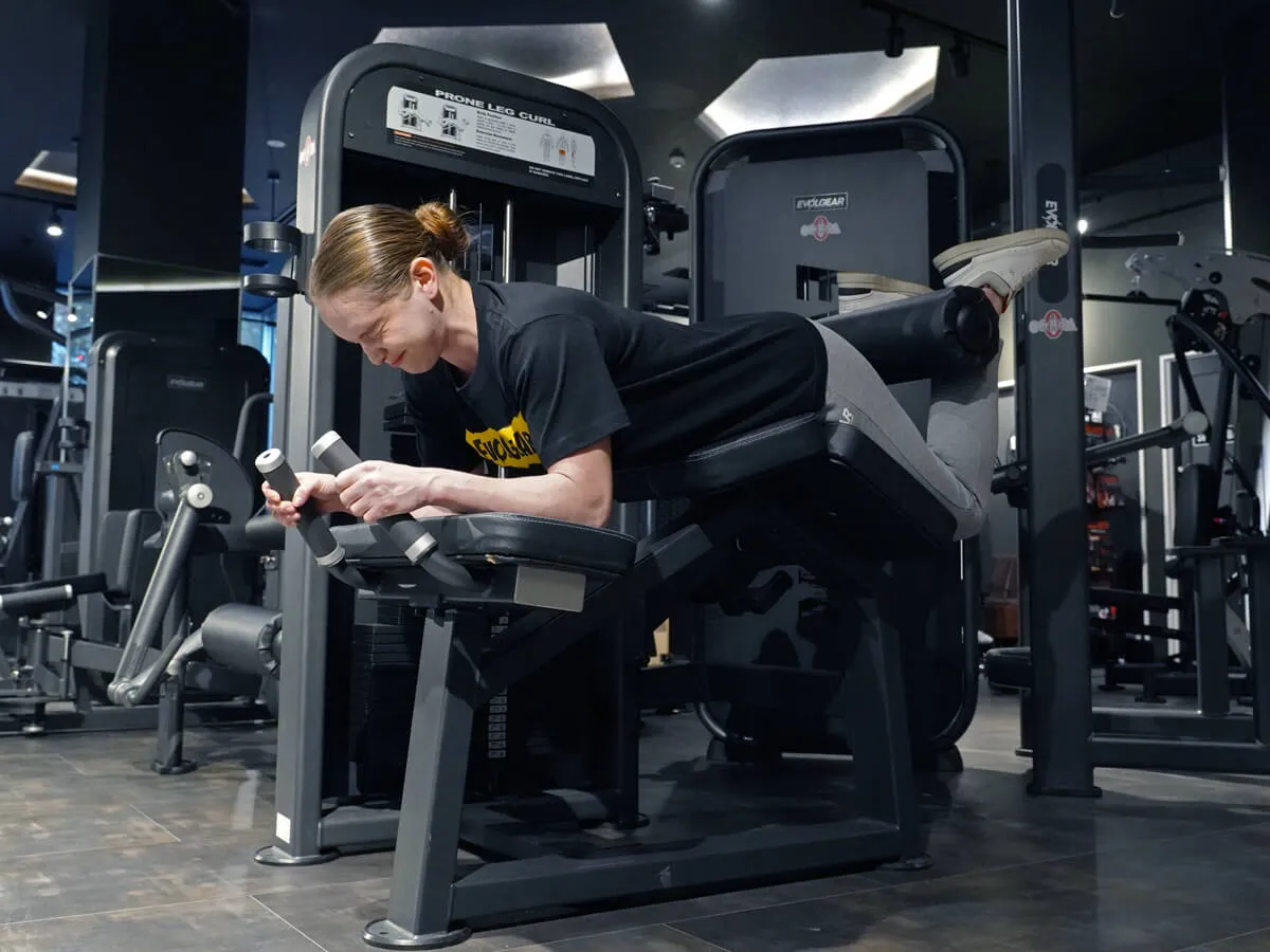 EVOLGEARのプローンレッグカール。特徴的なのは、その独自の形状とポジション設計です。寝転がった際の肘から腰の位置関係が山なりになっており、動作中に腰への負担がほとんどかからない構造になっています。一般的なライイングレッグカールでは腰に負担が出やすいものもありますが、このマシンでは安心して動作が可能です。グリップはラバー仕様で、しっかり握れるため安定感も抜群。動作中に重要なグリップ力をしっかりサポートしてくれます。さらに、足を支えるパッドは回転式になっており、引っかかりなくスムーズな動作が可能です。特に印象的なのは、パッドの動き。通常はくるぶしより上にずれてしまうケースも多いのですが、このマシンは一定のポジションをしっかり維持できるため、ストレスなくトレーニングに集中できます。また、パッドの位置は約15cmの範囲で調整可能。小柄な女性から大柄な男性まで、幅広いユーザーに対応できる汎用性を備えています。腰への負担を抑えつつ、スムーズで快適な動作ができる、非常に使いやすいマシンです。