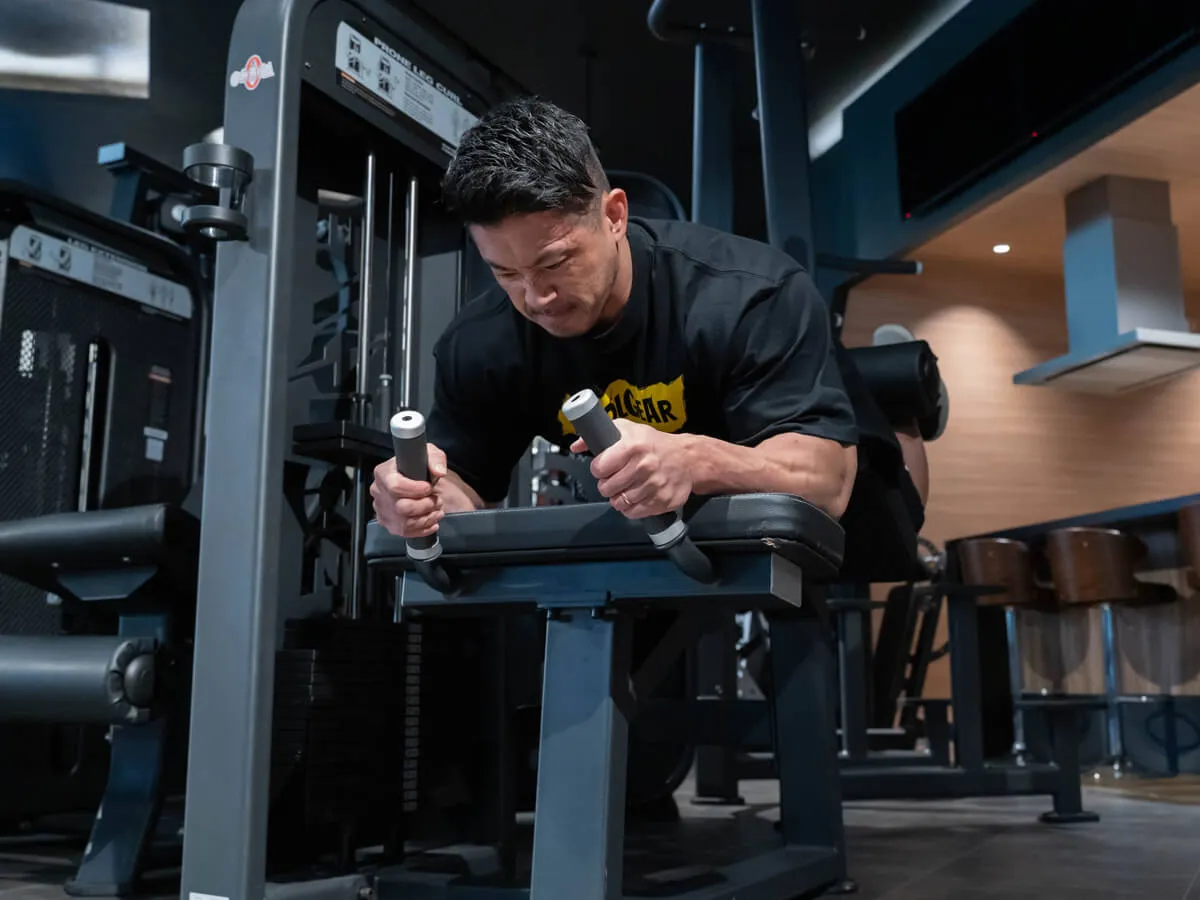 このプローンレッグカールは腿裏のトレーニングマシンなんですけど、僕が大好きなマシンの一つです。このマシンはうつ伏せでトレーニングするんですけど、個人的にシートのアングルが気に入っていて、このアングルで膝を曲げ伸ばししたときに腿裏に負荷が乗りやすい設計になっていると感じました。ウェイトスタック式なのでピンで簡単にウェイト調整が出来て、軽い重さからかなり重たい重量まで設定できますし、うつ伏せでやるレッグカールは腿の力を出しやすい種目なので、筋力を高めて筋肉をつけるっていう方にすごく向いているなと思いました。更にうつ伏せになってバーを握るようになっているのですが、バーの位置が上にあることで非常に握りやすくて力も入りやすい。ホールドが出来ないと腿裏に力を入れるのが難しいのですが、それが上手くできるような設計になっているオススメのマシンです。
