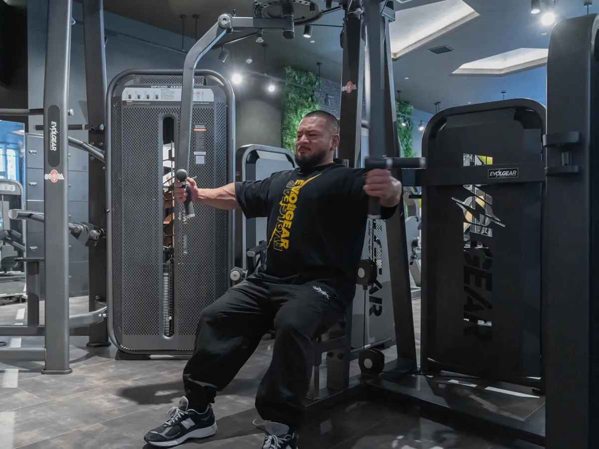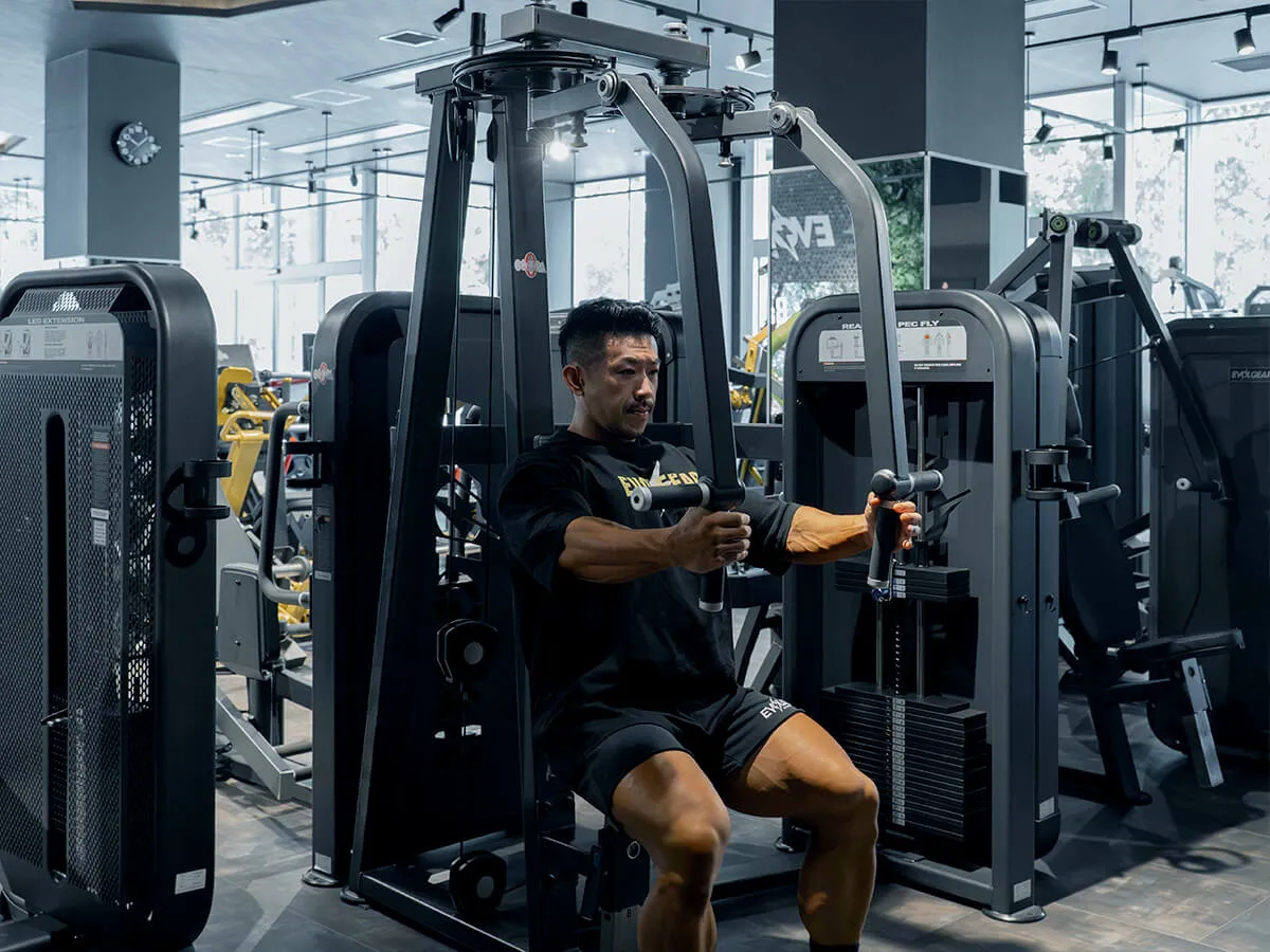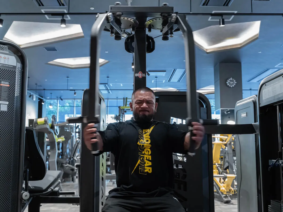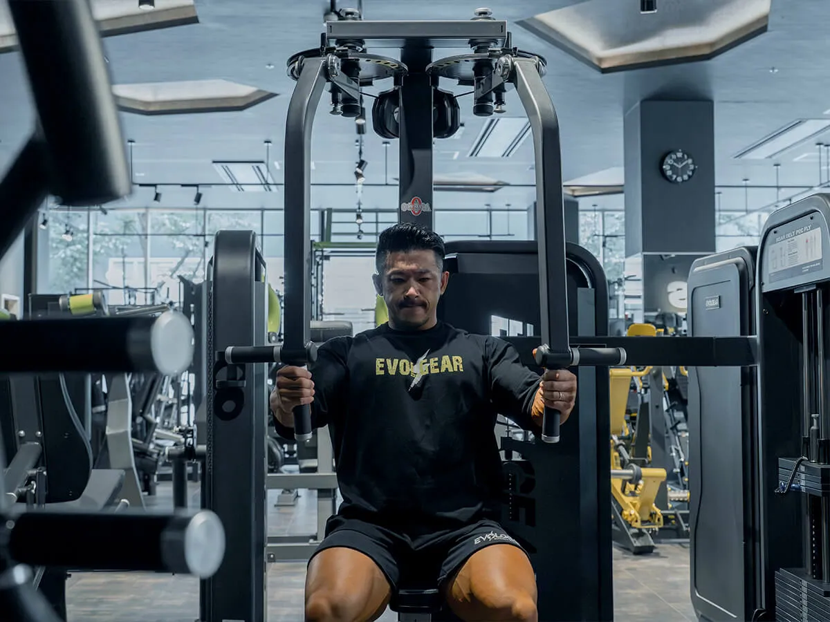 他のマシンと違う大きな特徴は、EVOLGEARのリアデルトペックフライが持つ可動域の広さです。大胸筋・三角筋後部ともに大きな可動域を確保でき、さらにアームは腕の長さに合わせて微調整が可能。ポジションによって曲げ伸ばしを変えることで、胸や肩への効かせ方にバリエーションを持たせられます。シートポジションも細かく調整でき、自分の体格や狙いたい部位に合わせたフォームをしっかり取れる設計です。そして特筆すべきは背もたれのパッド。半円柱状になっているため、フラットな背もたれよりも肩甲骨を寄せやすく、大胸筋を強くストレッチさせられる構造になっています。その結果、大胸筋への伸張刺激が大きく、効かせやすさが格段に向上しています。非常に使いやすく、僕自身も特にお気に入りのマシンです。