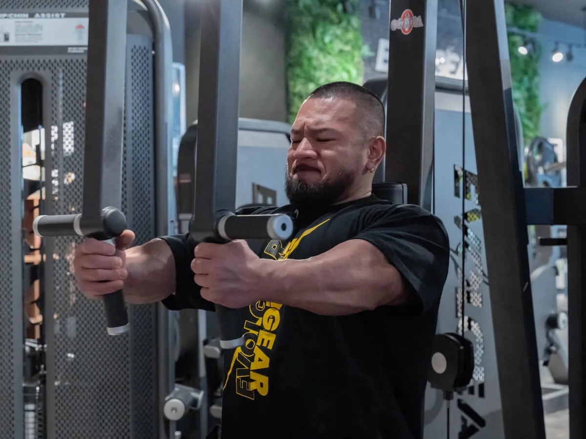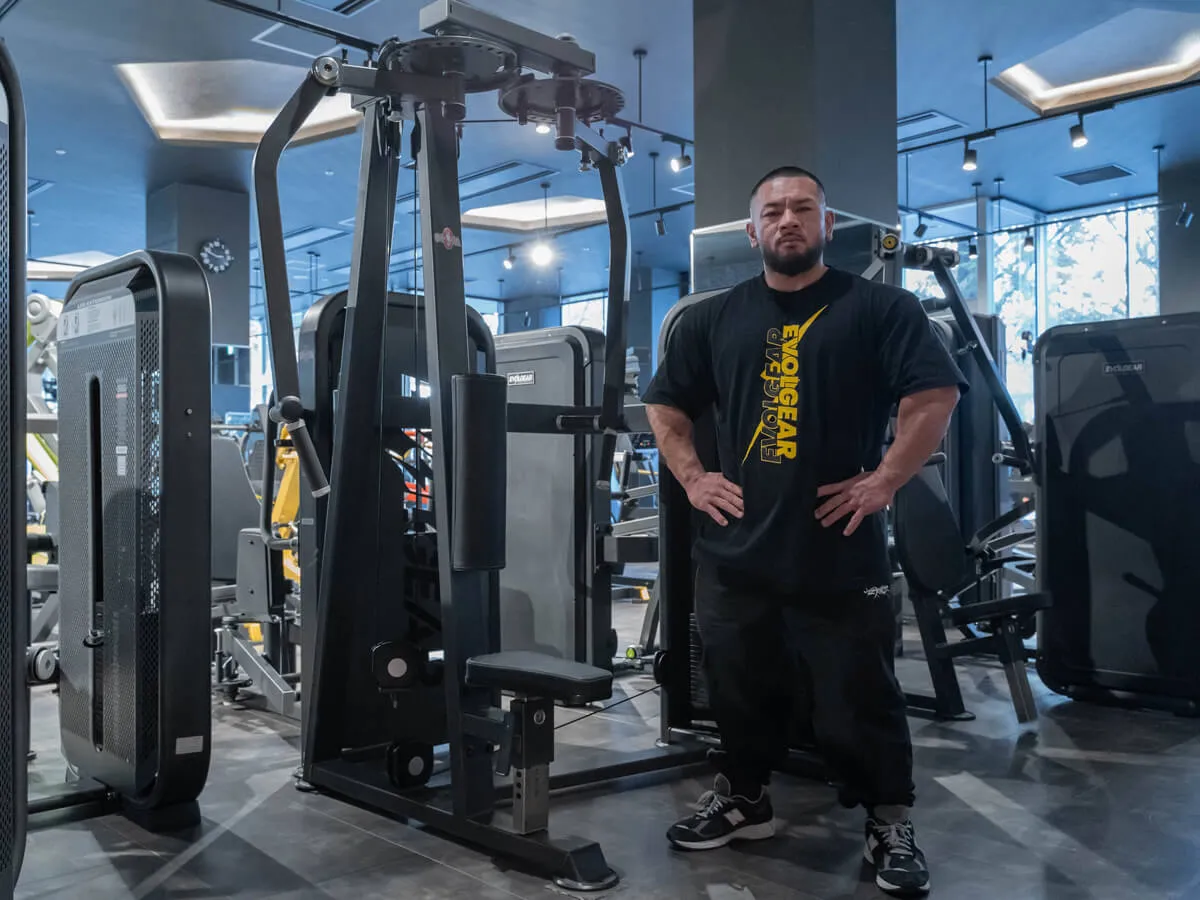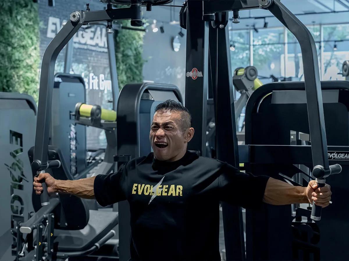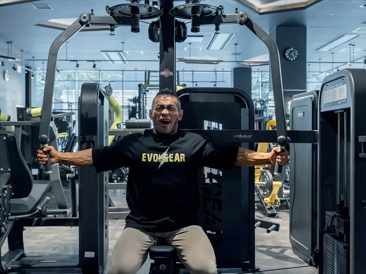 他のマシンと違う大きな特徴は、EVOLGEARのリアデルトペックフライが持つ可動域の広さです。大胸筋・三角筋後部ともに大きな可動域を確保でき、さらにアームは腕の長さに合わせて微調整が可能。ポジションによって曲げ伸ばしを変えることで、胸や肩への効かせ方にバリエーションを持たせられます。シートポジションも細かく調整でき、自分の体格や狙いたい部位に合わせたフォームをしっかり取れる設計です。そして特筆すべきは背もたれのパッド。半円柱状になっているため、フラットな背もたれよりも肩甲骨を寄せやすく、大胸筋を強くストレッチさせられる構造になっています。その結果、大胸筋への伸張刺激が大きく、効かせやすさが格段に向上しています。非常に使いやすく、僕自身も特にお気に入りのマシンです。