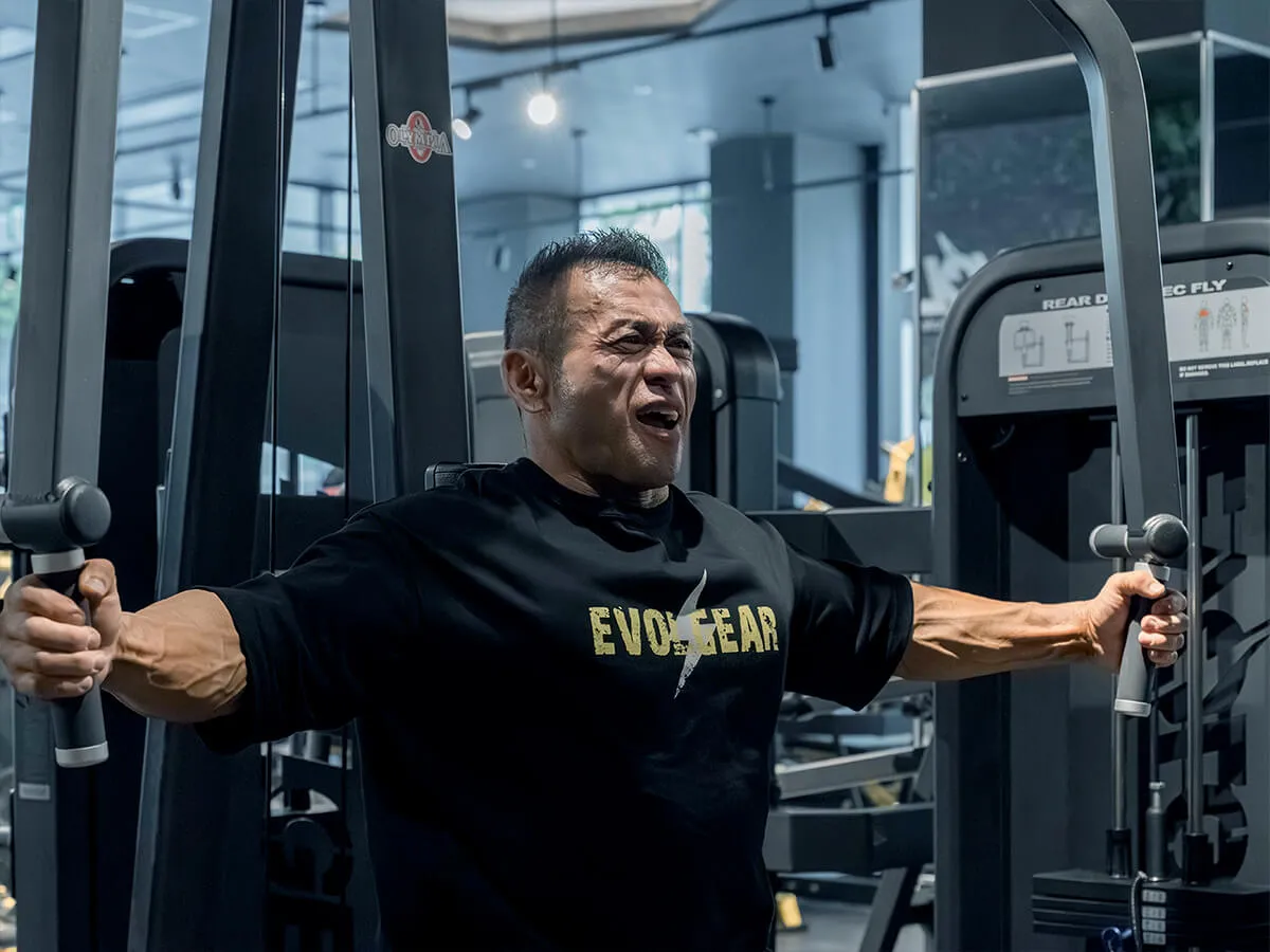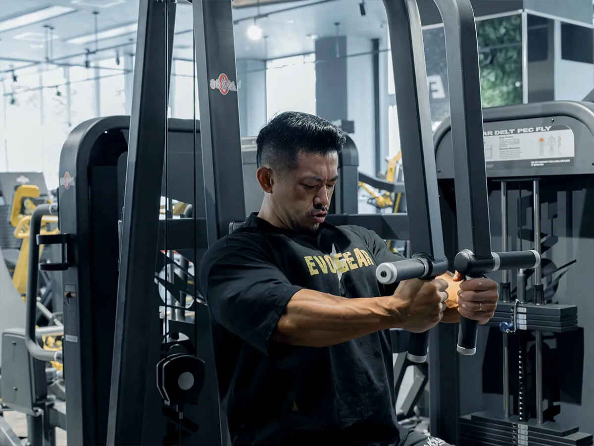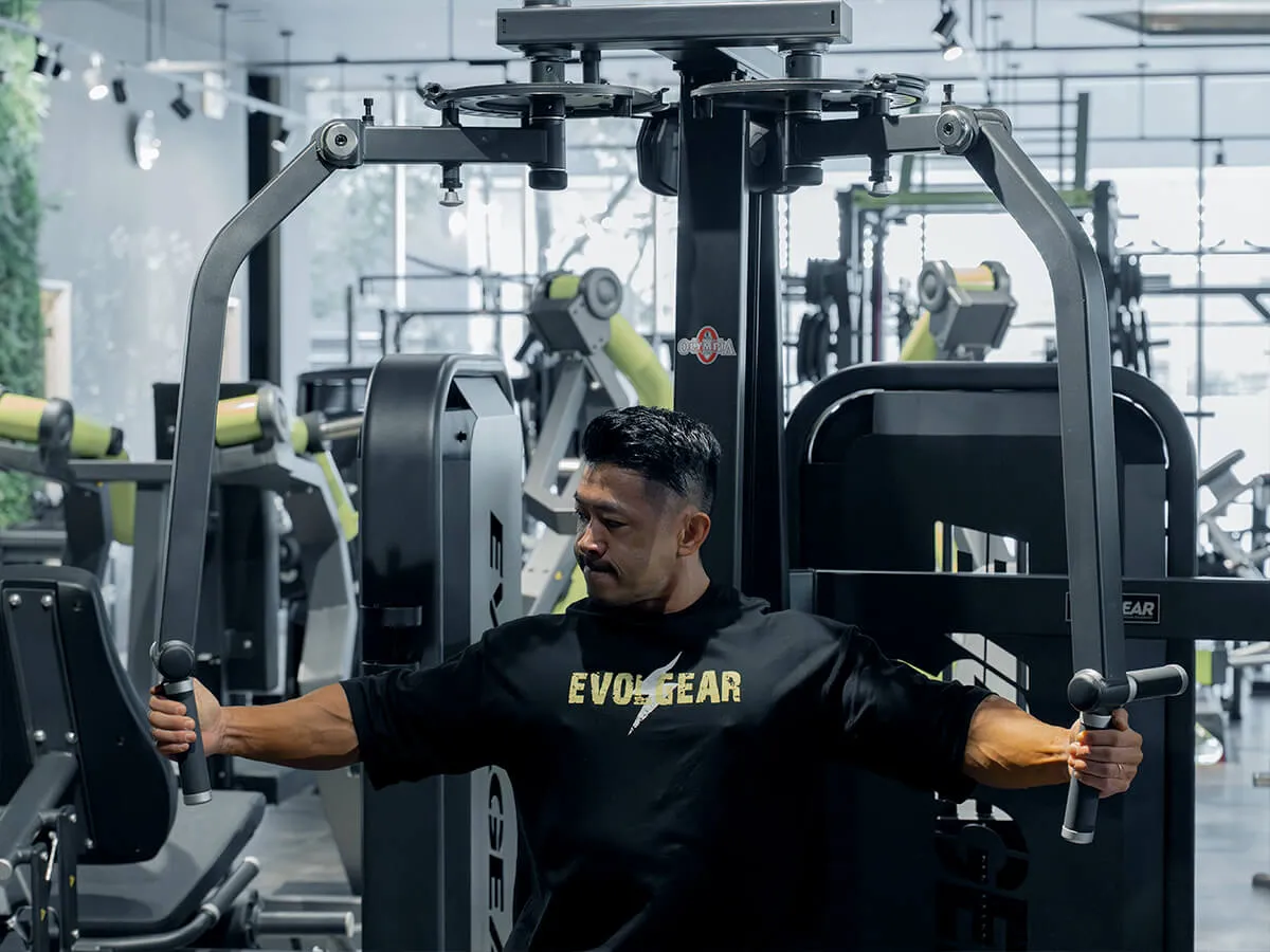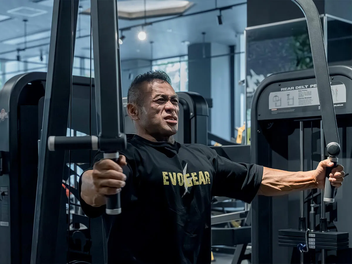 他のマシンと違う大きな特徴は、EVOLGEARのリアデルトペックフライが持つ可動域の広さです。大胸筋・三角筋後部ともに大きな可動域を確保でき、さらにアームは腕の長さに合わせて微調整が可能。ポジションによって曲げ伸ばしを変えることで、胸や肩への効かせ方にバリエーションを持たせられます。シートポジションも細かく調整でき、自分の体格や狙いたい部位に合わせたフォームをしっかり取れる設計です。そして特筆すべきは背もたれのパッド。半円柱状になっているため、フラットな背もたれよりも肩甲骨を寄せやすく、大胸筋を強くストレッチさせられる構造になっています。その結果、大胸筋への伸張刺激が大きく、効かせやすさが格段に向上しています。非常に使いやすく、僕自身も特にお気に入りのマシンです。