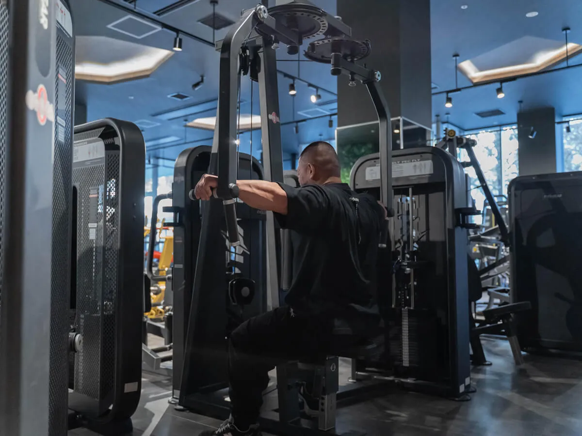 リアデルト&ペックフライ。名前のとおり、肩の後ろ(リアデルト)と胸(大胸筋)、この2つの部位を1台で鍛えることができるマシンです。胸は収縮、肩は後ろへ引く。動きの方向が違う筋肉を、この1台で効率よく鍛えられるのが特徴ですね。アームは可動式になっており、可動域を自在に調整できます。ペックフライを行うときにはアームが大きく後ろまで動くため、全可動域を使ってしっかりストレッチをかけることが可能。逆に肩を痛めている方や可動域を制限したい場合には、細かく設定を変えて自分の柔軟性に合わせられる点が安心です。また、シートの高さも身長や狙いたい部位に応じて調整可能。あえて高めに設定して大胸筋上部を狙ったり、低めにして下部を意識したりと、トレーニングの幅が広がります。ウェイトはピン式なので、プレートの付け外しが不要でスムーズ。トレーニング中に簡単に重量調整ができるのもポイントです。胸と肩を効果的に鍛えたい人にとって、非常に使い勝手のいいマシンですね。