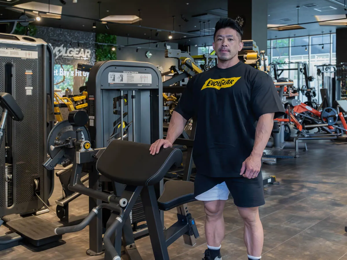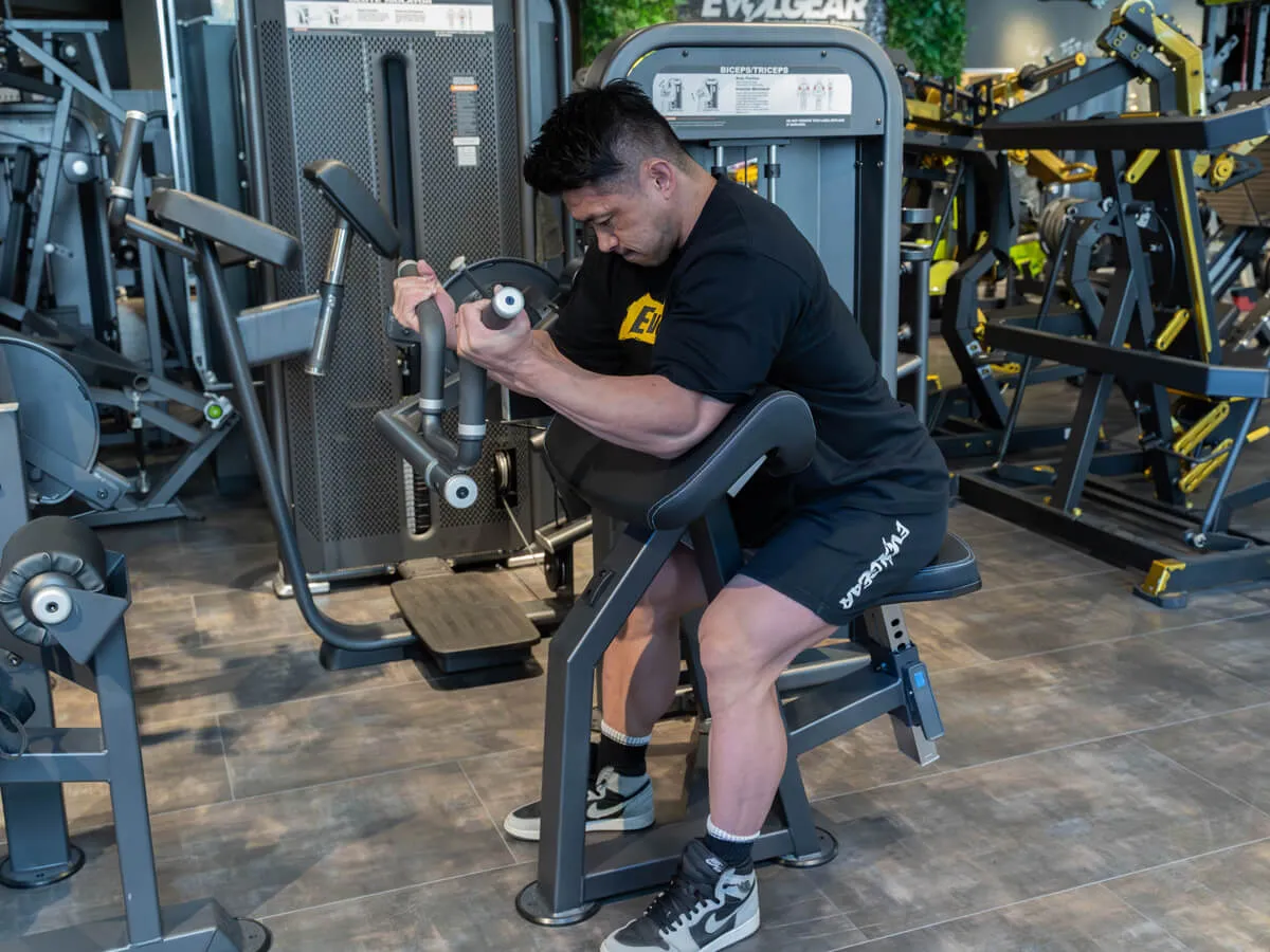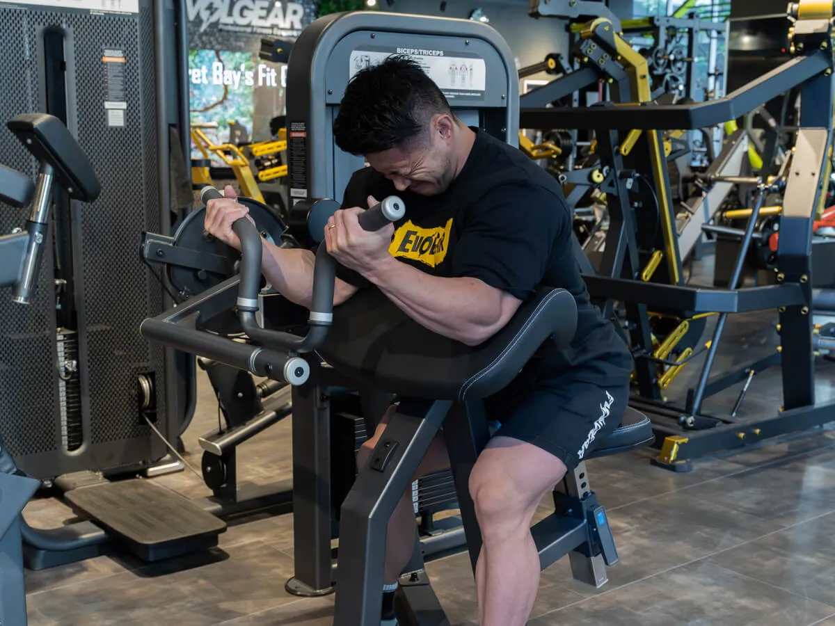 こちらは上腕二頭筋・上腕三頭筋の2つの筋肉を鍛えられるマシン。1台で2役こなすという非常に素晴らしいマシンです。ジムはもちろんホームジムなんかで、あまりスペースがないというときでも、これは1台で2つの筋肉を鍛えることができるから便利だよね。まずはトライセプスのポジション。簡単に可動域を調整することが出来る。そしてバイセプスもバーの位置を変えると、台に肘を置いたプリーチャーカールが出来る。そしてもちろんウェイトスタックはピン式で変更可能。簡単にウェイトを調整することが出来る。つまり、ドロップセットなどのトレーニングテクニックなども簡単に使いやすいということ。そして当然身長に応じてシートを調整出来るので、背が低い人から大きな人まで幅対応することができます。トライセプスは肘を固定したまま伸ばす事によって、三頭筋のアイソレートが可能になる。三頭筋のストレッチを安全に行うことが出来るので、例えばフリーウェイトやバーベルでライイングエクステンションをやると肘が痛いという人でも、このマシンであれば肘の痛みがない可能性が高い。そしてまだ痛めてない人でも痛める可能性が少ない。非常にポピュラーな種目を安全にトレーニング出来る優れたマシンだね。